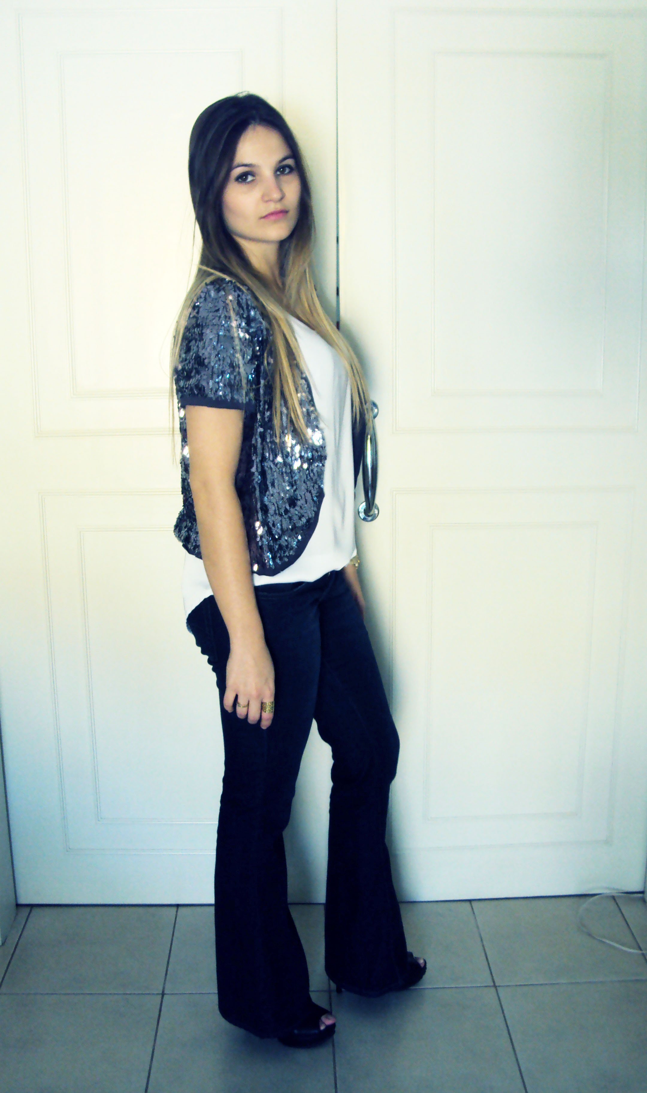 Calça jeans flare + regata de seda + casaquinho de paetê = look bapho!