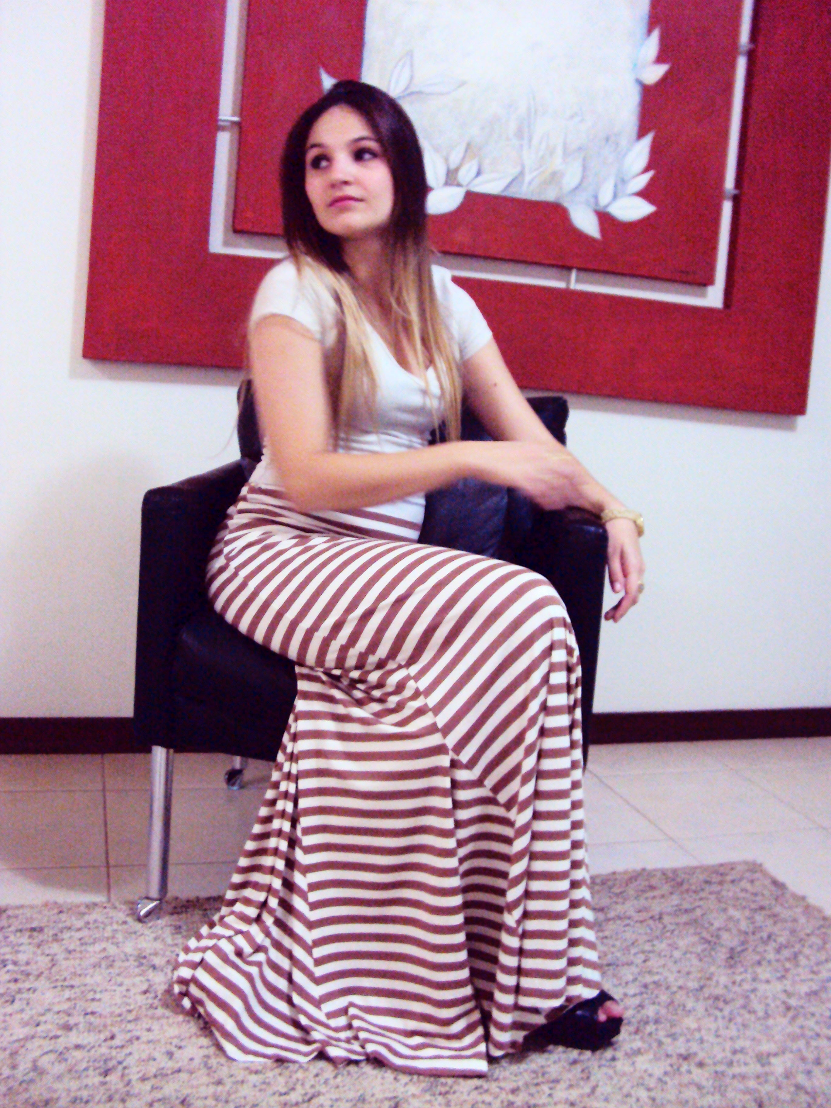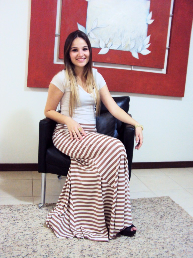O look que a Impactto Modas preparou para hoje é básico, porém com duas propostas que estão super em alta, que são saia longa e listras.