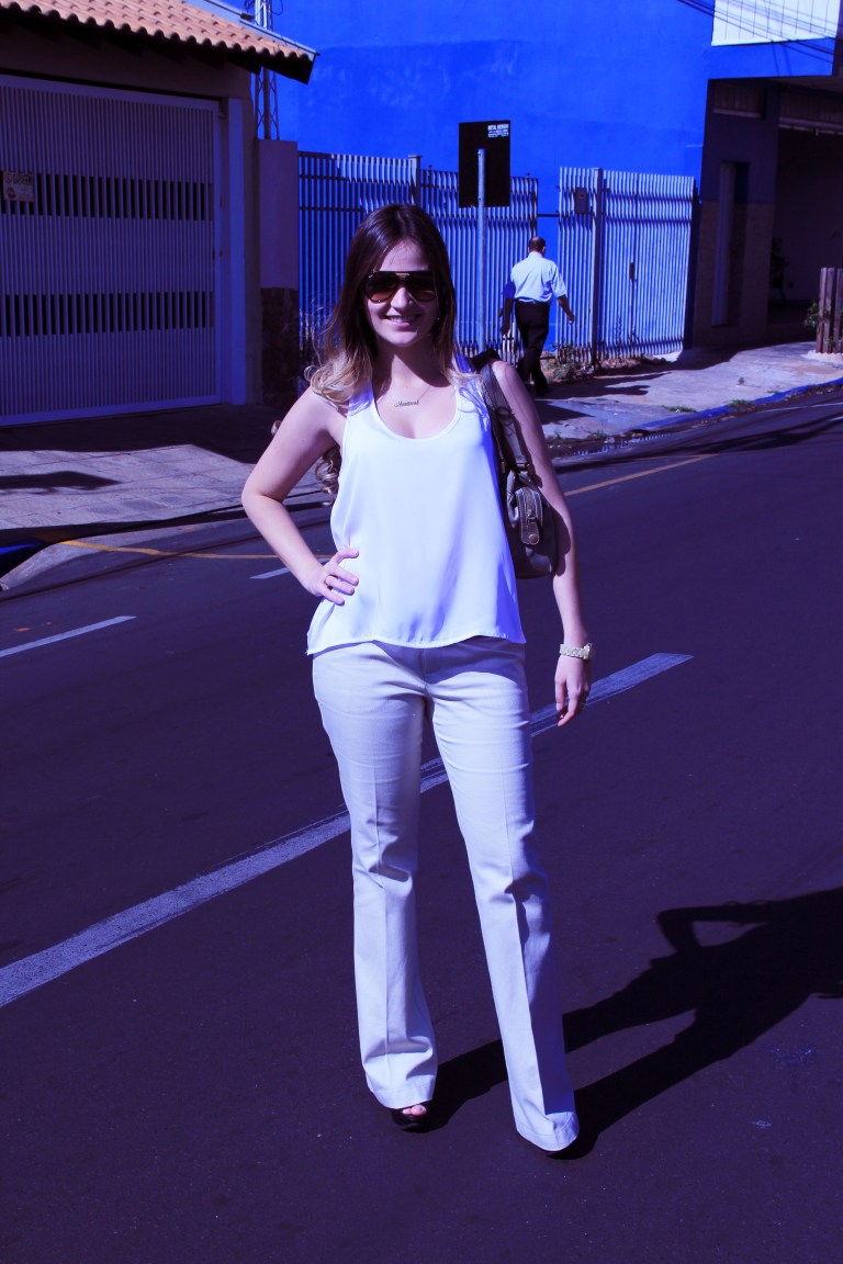 06/10/2011 Look do dia Hoje o dia foi agitado… tirei várias fotos das novidades, look lindos! E não podia deixar de tirar foto do meu Look do dia. Calça flare de piquet bege + regata de seda branca + bolsa Kipling e óculos Ray-Ban. Compartilhe isso:TweetCurtir Carregando... Relacionado