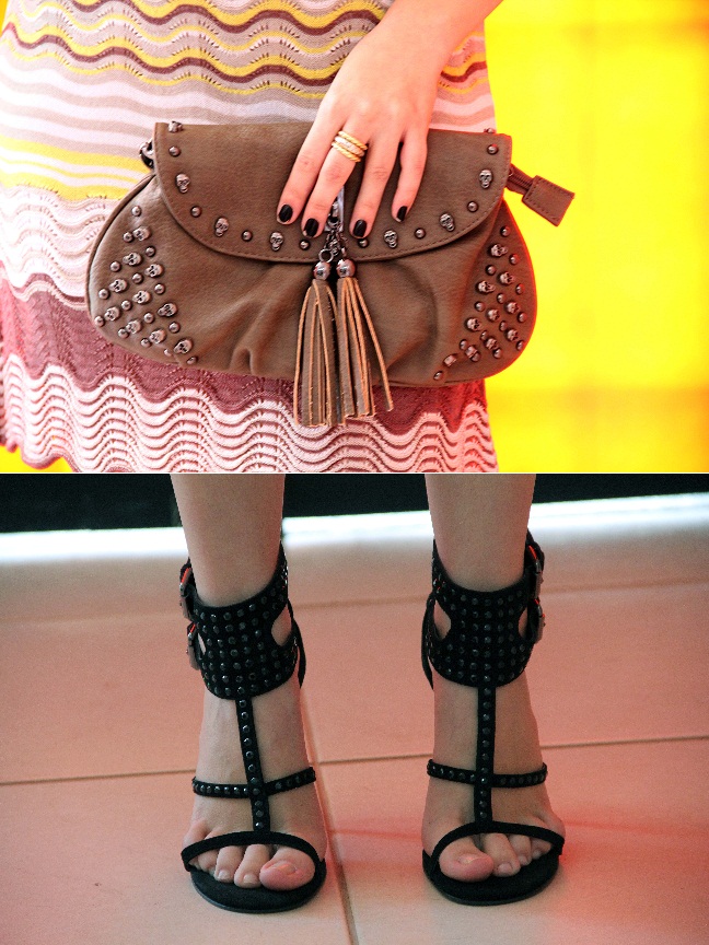 Zoom na bolsa e sandália: A bolsa é um arraso, as taxas em formato de caveiras dão um ar todo despojado à peça. Já a sandália, preta, porém nada básica devido às suas aplicações em taxas.