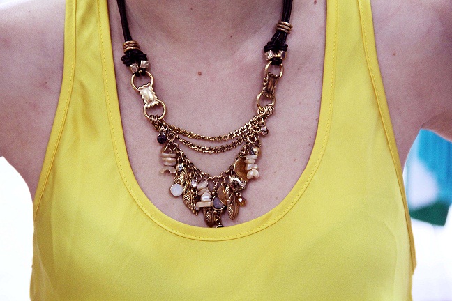 LOOK 4 – Saia aves: As estampas com animais, flores, árvores, tudo que nos remete à fauna/flora estão em bastante evidência nas passarelas. No look o foco foi a saia, com uma estampa de aves, a mistura de cores vibrantes da saia + a blusa amarela deu um ar bem alegre e descontraído ao look. Eu amei! O maxi colar + a bolsa de franjas deram um tchan a mais no visual.