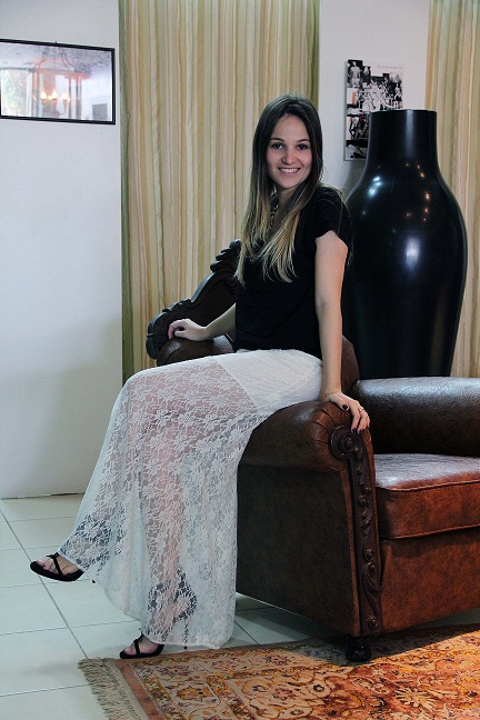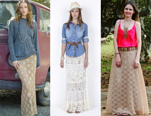 A trend da vez é a saia longa de renda. Na maioria das vezes ela vem em tons claros, como o branco, nude, rose ou bege. Mas também aparece em cores mais escuras como o preto, marrom e marinho.