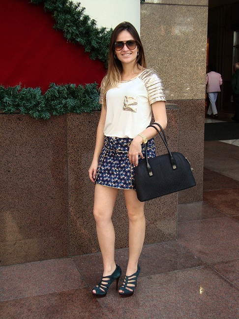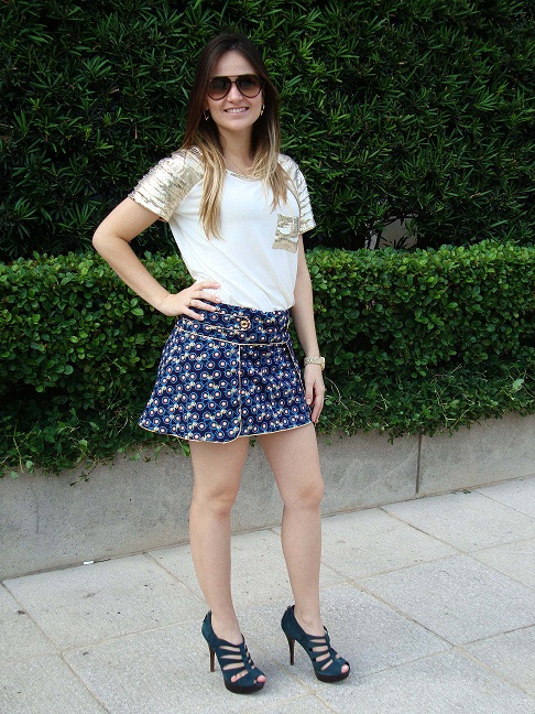 YEAH!!! Pedi, pedi e o tempo esquentou aqui em SP. Fui almoçar no Shopping Iguatemi e fotografei meu look do dia. Saia/short + camisetinha com detalhe metalizado nas mangas e no bolso.
