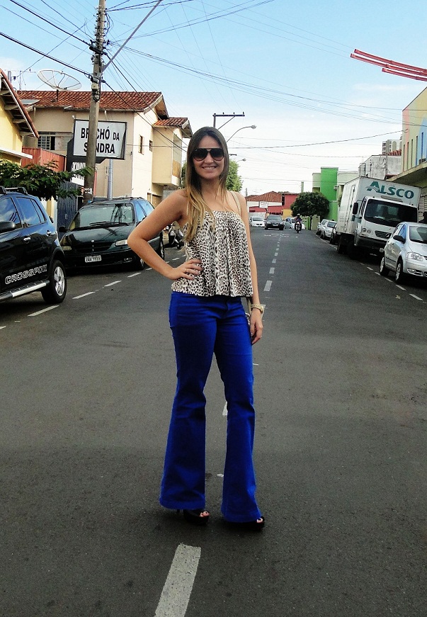 Na verdade esse look usei no começo da semana, mas estava sem tempo, por isso só estou postando agora! Usei pra ir trabalhar, calça flare azul royal com um top de onça! Adoro essa mistura: cor vibrante + animal print.