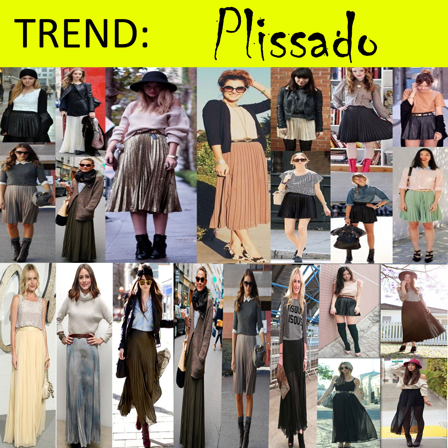 PLISSADO: Os plissados são tecidos com pregas feitas à máquina, que não se desmancham. É um pregueado regular criado por penses costuradas ou prensadas no tecido. Antigamente, era usado em vestidos de festas, por sua leveza e elegância, mas voltou com tudo esse ano e ganhou as ruas. Ela é super feminina, valoriza o corpo da mulher e dá um movimento incrível.