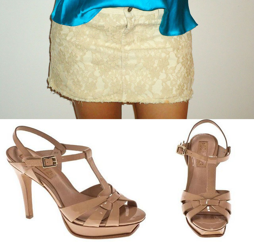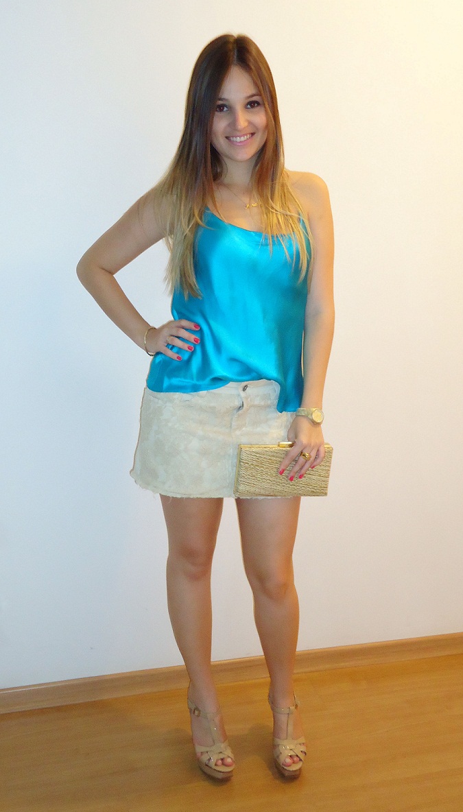Esse começo de ano estou um pouquinho ausente, desculpem! Esses últimos dias estava com uma enxaqueca brava, sem condições de tirar fotos e postar. Mas melhorei e estou zero. Ontem saí com alguns amigos, fui no Sushi Bar e Restaurante Seo Manga. E vou mostrar pra vocês o look que usei. Coloquei uma saia jeans bege com detalhes de renda na frente e nos bolsos + uma blusa de cetim azul turquesa + sandália de verniz bege da Schutz, modelo YSL e clutch dourada.