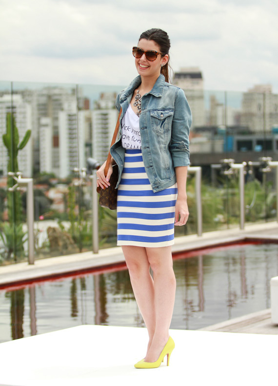 Look: Saia listrada modelo lápis (Zara), T-shirt (La Paiva), Jaqueta jeans (Zara), Colar (Doida de Pedra) e Scarpin (Schutz).