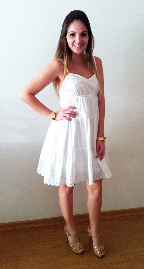 Vestidinho: Se você quer um modelito mais romântico e delicado, vestidinhos com detalhes de renda, bordado inglês, etc, dão um toque bem menininha ao look. Quanto mais soltos mais charmosos. E o branco, pra mim, é a cor mais chique que existe! Dica: Pra dar um toque de glamour ao vestido, coloque acessórios poderosos.