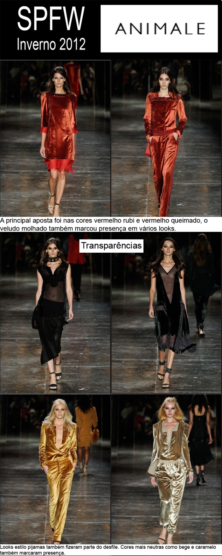 ANIMALE: No desfile da Animale as cores que prevaleceram foram: vermelho rubi, vermelho queimado, bege e caramelo. Looks estilo pijama e vestidos com comprimentos midi foram a marca forte do desfile. E o veludo molhado ganhou forma em calças, vestidos e casaquinhos.