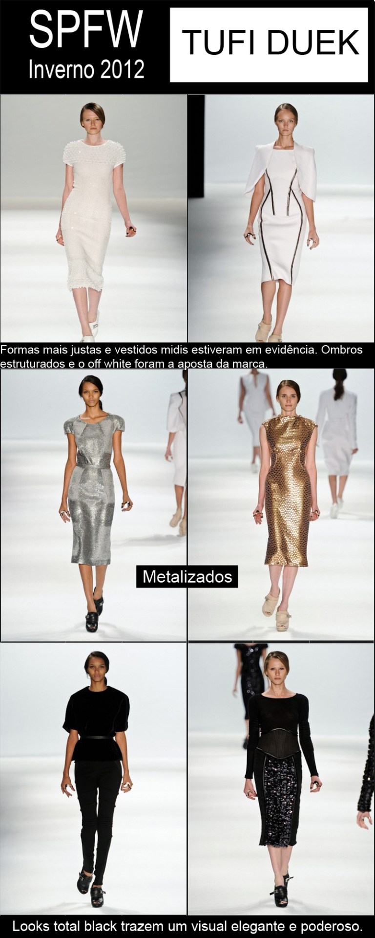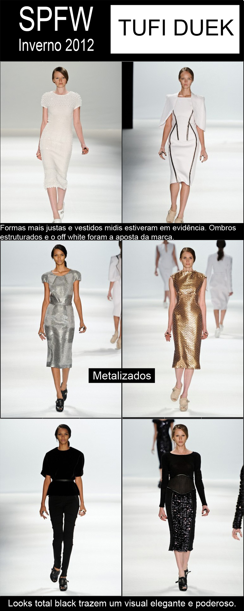 TUFI DUEK: Paetê foi a ‘peça-chave’ nos looks de Tufi Duek. Metalizados e brilhos apareceram em grande estilo. Mas não só de brilho se fez a passarela, cores neutras como preto e off white trouxeram elegância a looks mais justos, que marcam a silhueta, uma maneira de mostrar o sensual sem ser vulgar.