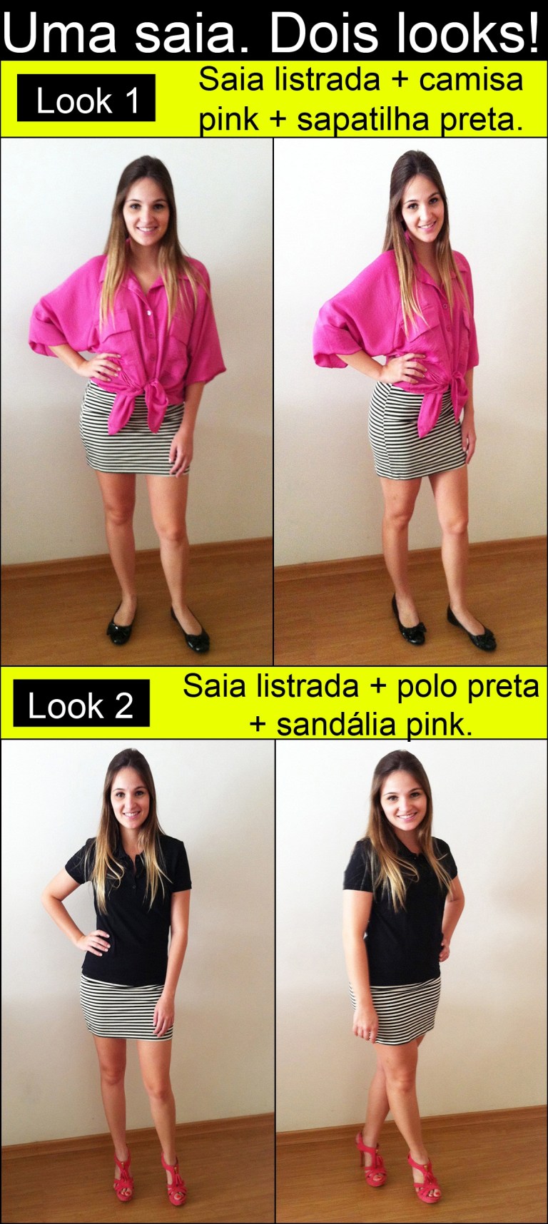 Hoje vou dar uma dica de como usar a mesma peça, mas mudando completamente o look. Porque muitas vezes temos uma peça e não sabemos como usá-la… A peça-chave do look é a saia listrada P&B. Montei dois looks diferentes com ela… Eu adoro usar listras com cores fortes, como laranja, verde bandeira, azul royal, pink, amarelo, etc… Particularmente, acho lindo e super fashion a combinação de listras (P&B) com a cor pink – e por isso minha escolhida na hora de montar os looks foi ela.