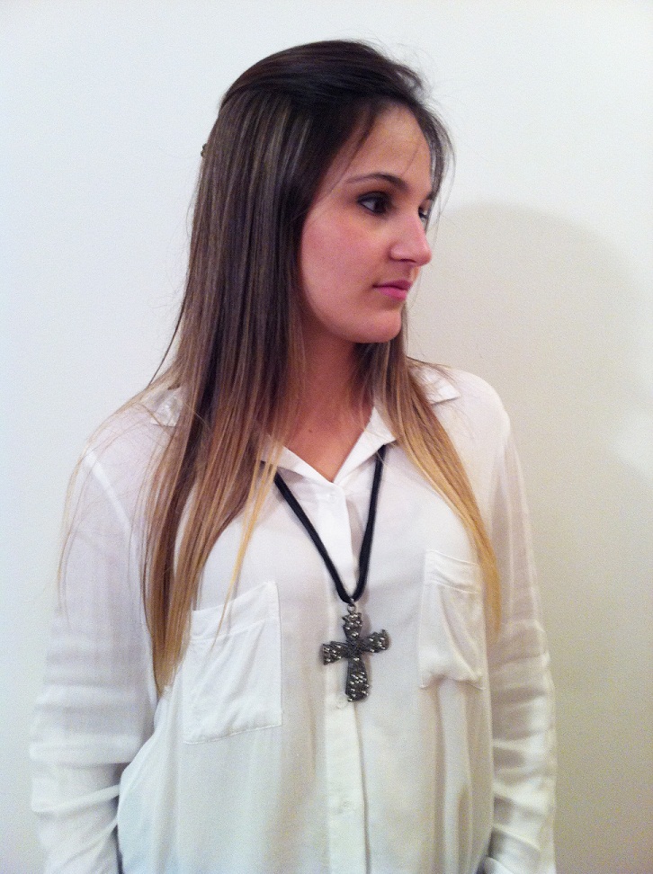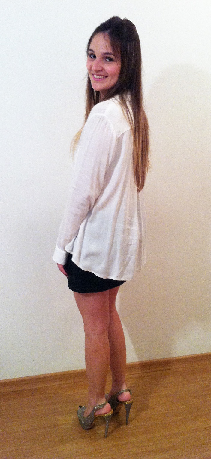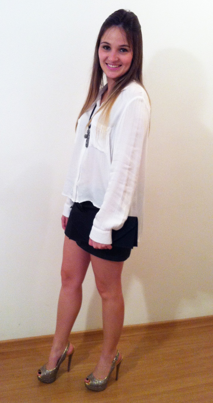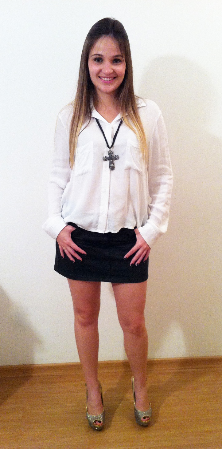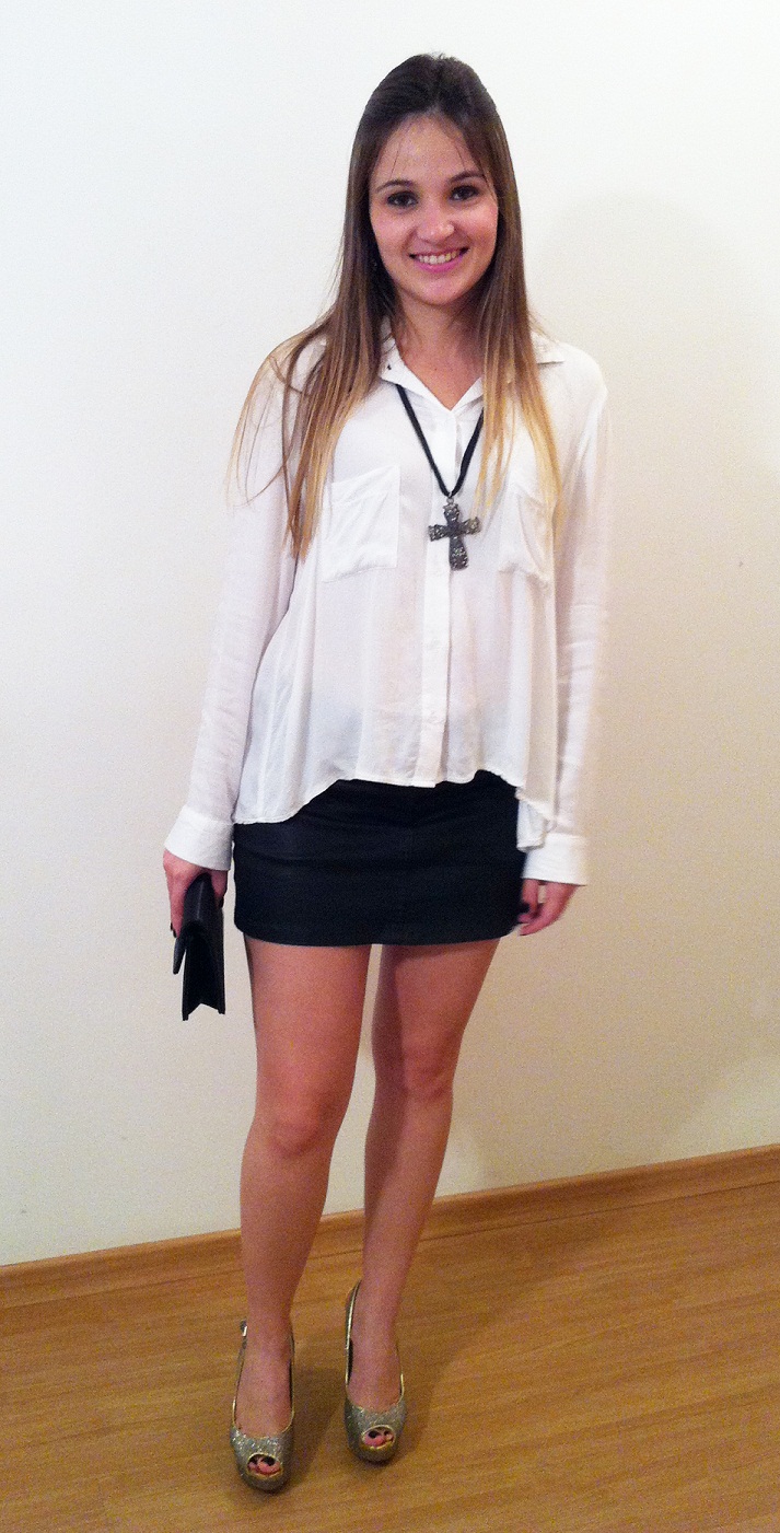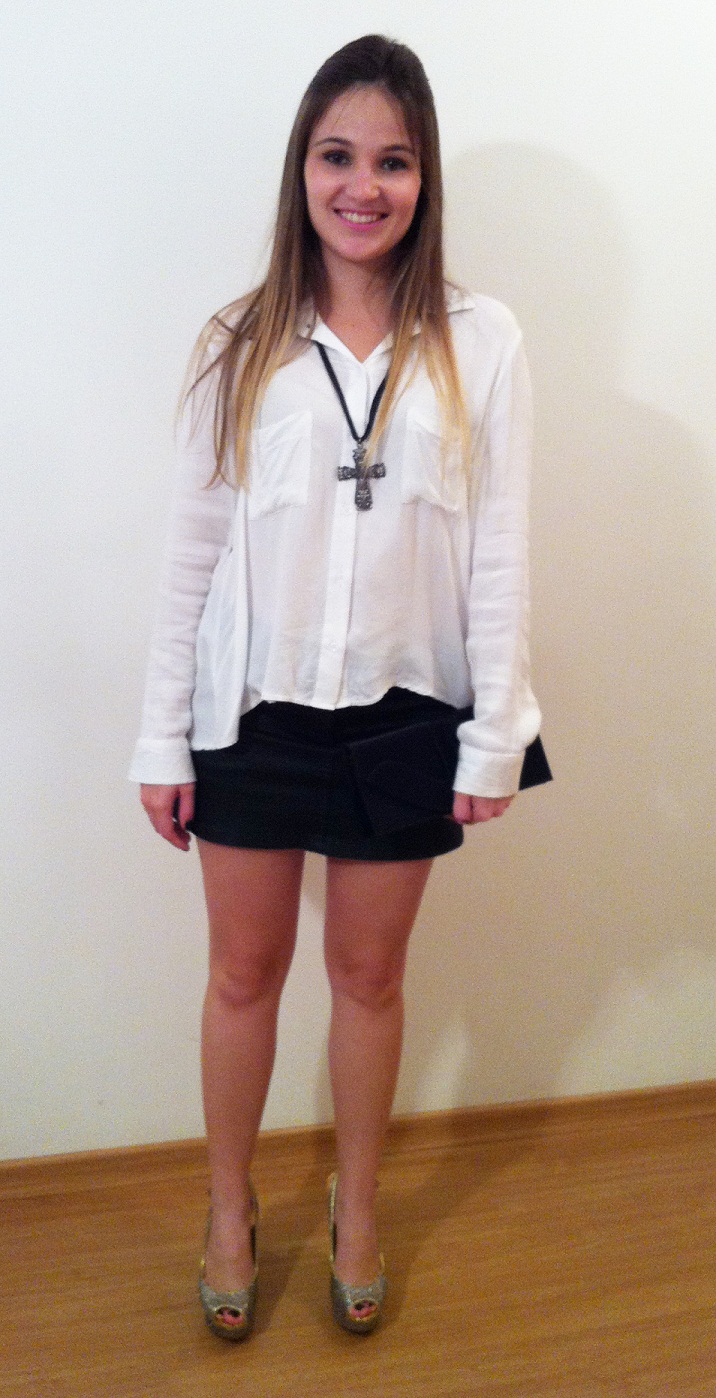 Ontem saí com alguns amigos, fomos pra um barzinho… Como por aqui o clima está meio maluco, uma hora chove, outra faz sol, frio e calor… a temperatura está inconstante… A noite estava mais fresquinho, então optei por uma camisa de manga longa branca (estilo mullet, curta na frente e mais comprida atrás), mas tecido mais leve… e saia de couro preta… O look foi total P&B, acho chique!! Hehehe… E nós pés, sandália de glitter.
