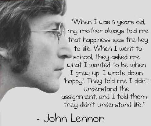 “Quando eu tinha 5 anos, minha mãe sempre me dizia que felicidade era a chave da vida. Quando fui pra escola, me perguntaram o que eu queria ser quando crescer. Eu escrevi: feliz. Aí disseram que eu não tinha entendido a pergunta e eu respondi que eles não tinham entendido a vida.” (John Lennon)