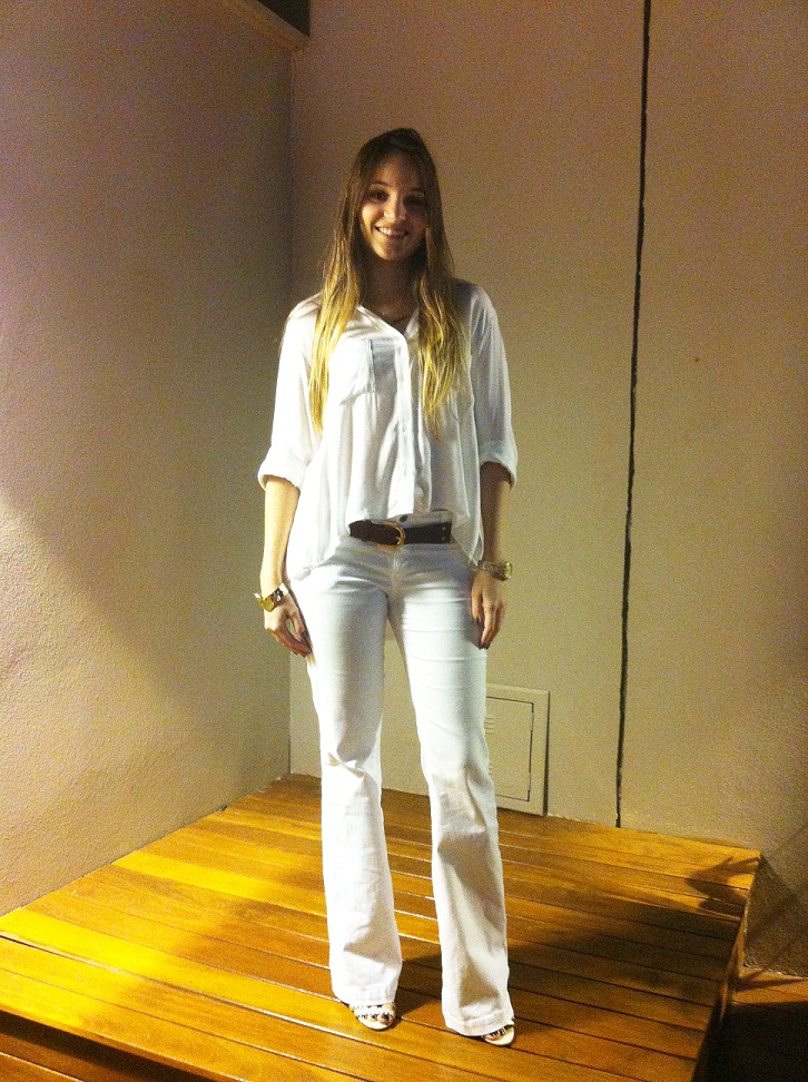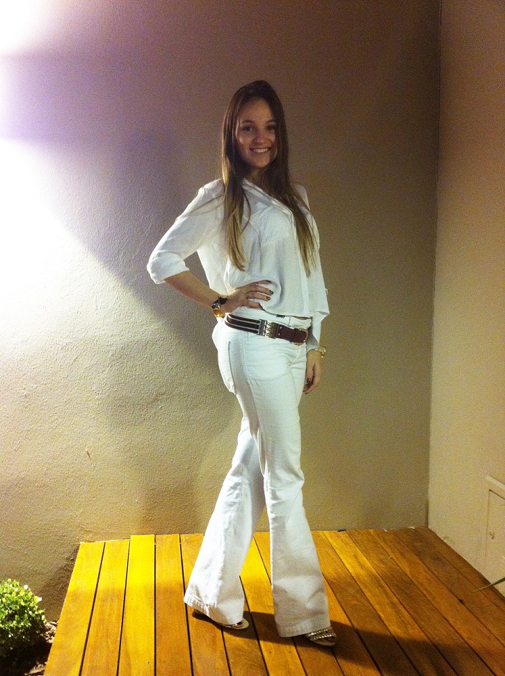 O look usei ontem pra um jantarzinho nada leve na casa do meu amigo Fábio. Querem saber qual foi o cardápio? Leitoa recheada, hummm estava uma delícia! Optei pela leveza do look total white, com minha calça flare branca de guerra, companheira inseparável de “Look do dia” + camisa mullet branca – pra dar uma quebrada no branco, coloquei um cinto listrado (marrom + burgundy) e sandália e acessórios dourados.