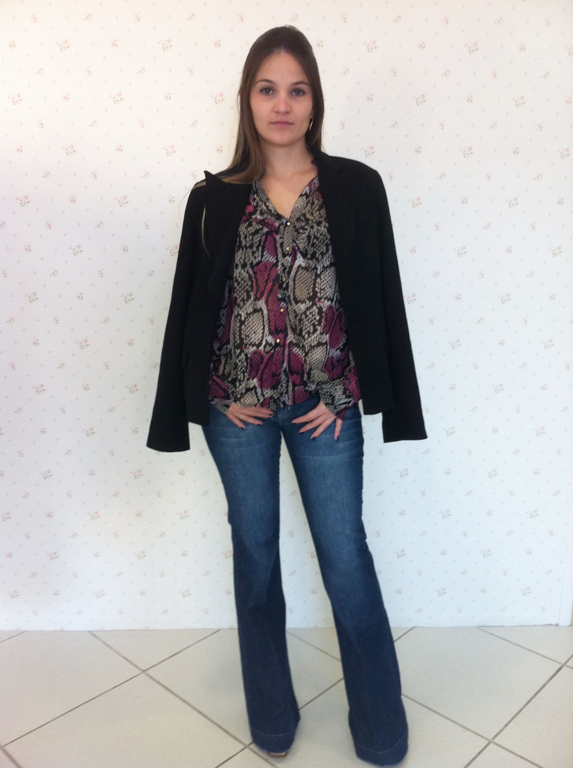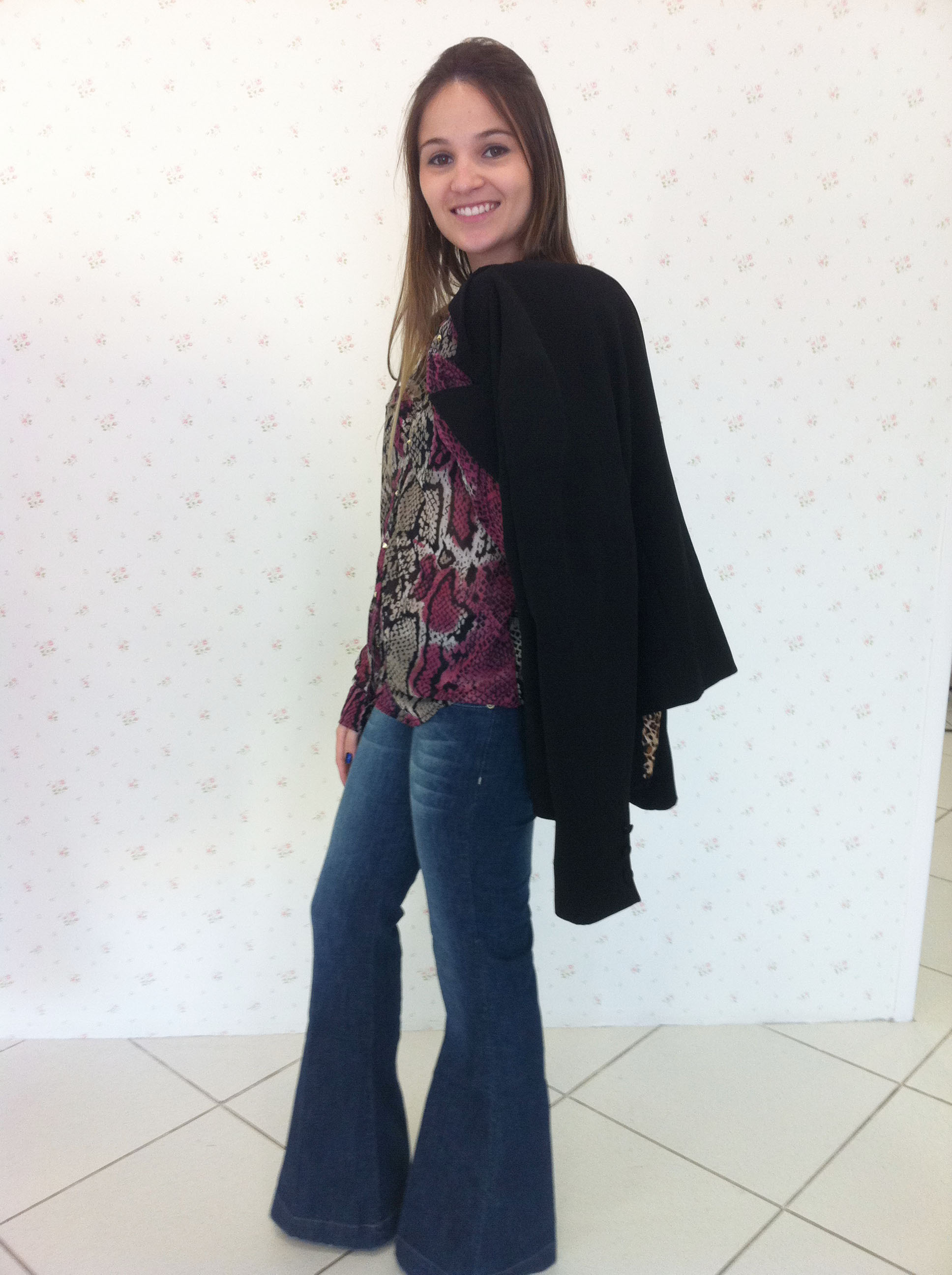 Olá meninas… Com essa chuvinha inesperada, parece que o clima resolveu mudar e deu uma leve “esfriada” – para nossa alegria! Então, vim dar uma dica de look para usar nessa noite de sábado… Nada melhor que uma bela e confortável calça jeans flare + camisa snake print + blazer – look perfeito para arrasar no jantarzinho com o boy ou na balada com a galera!