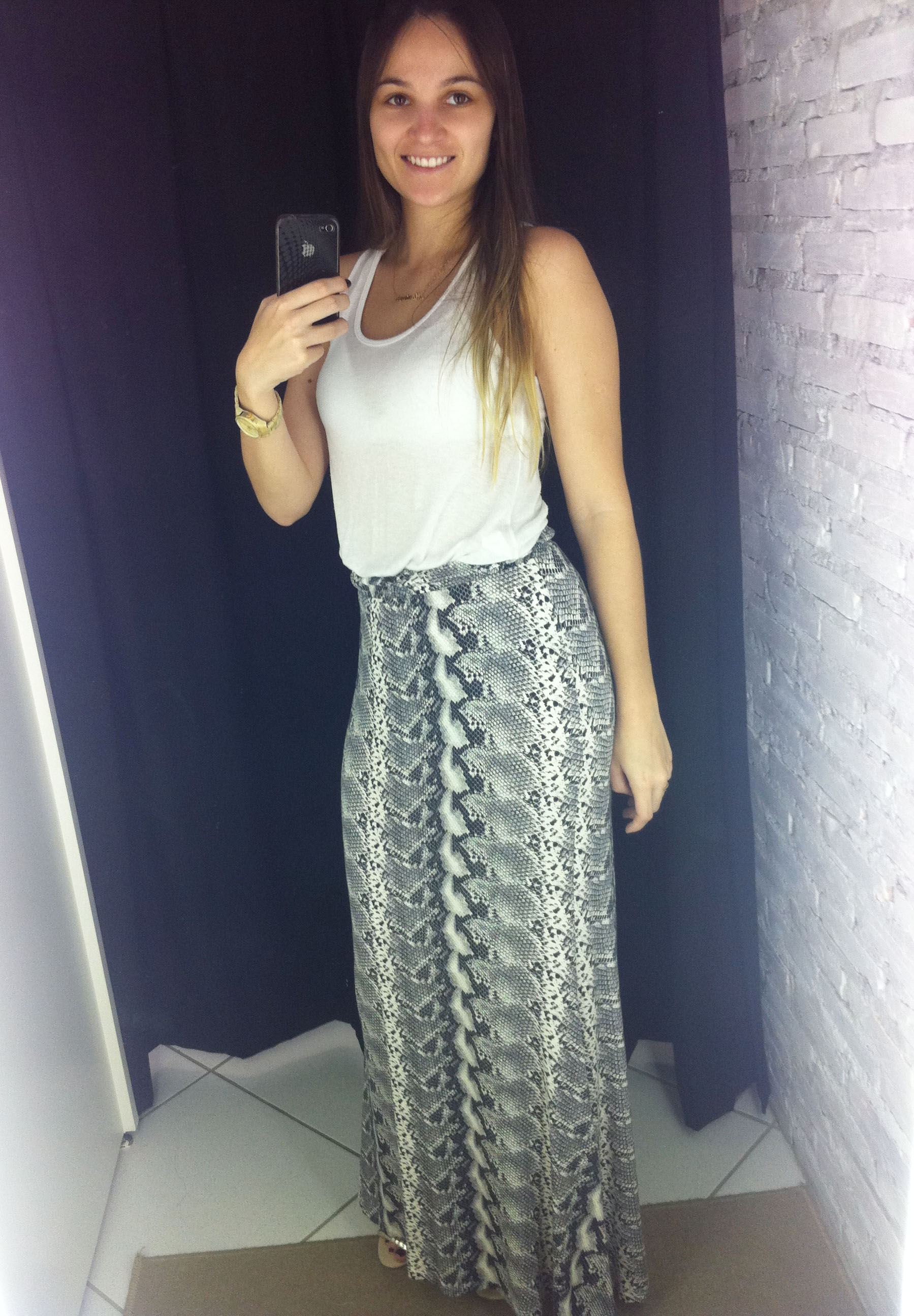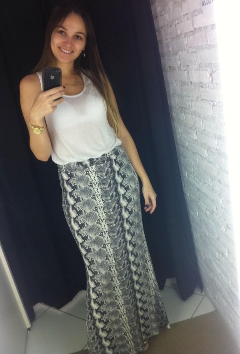 Esse look eu ia postar ontem, mas acabou não dando tempo, então lá vai… Usei minha saia com estampa de cobra – que vocês já viram aqui – com uma regata branca. Um look bem bacana, que pode ser usado tanto durante o dia quanto a noite.