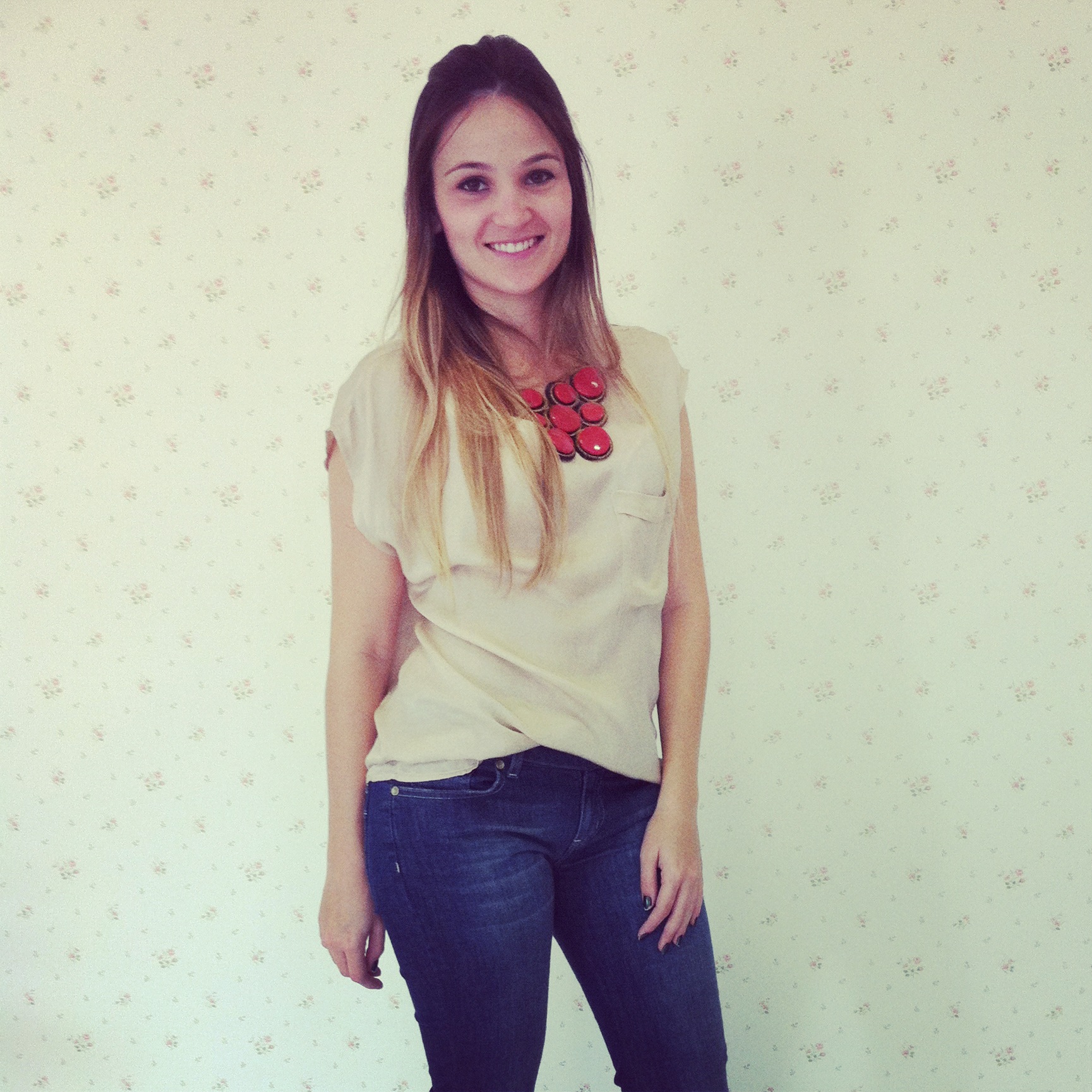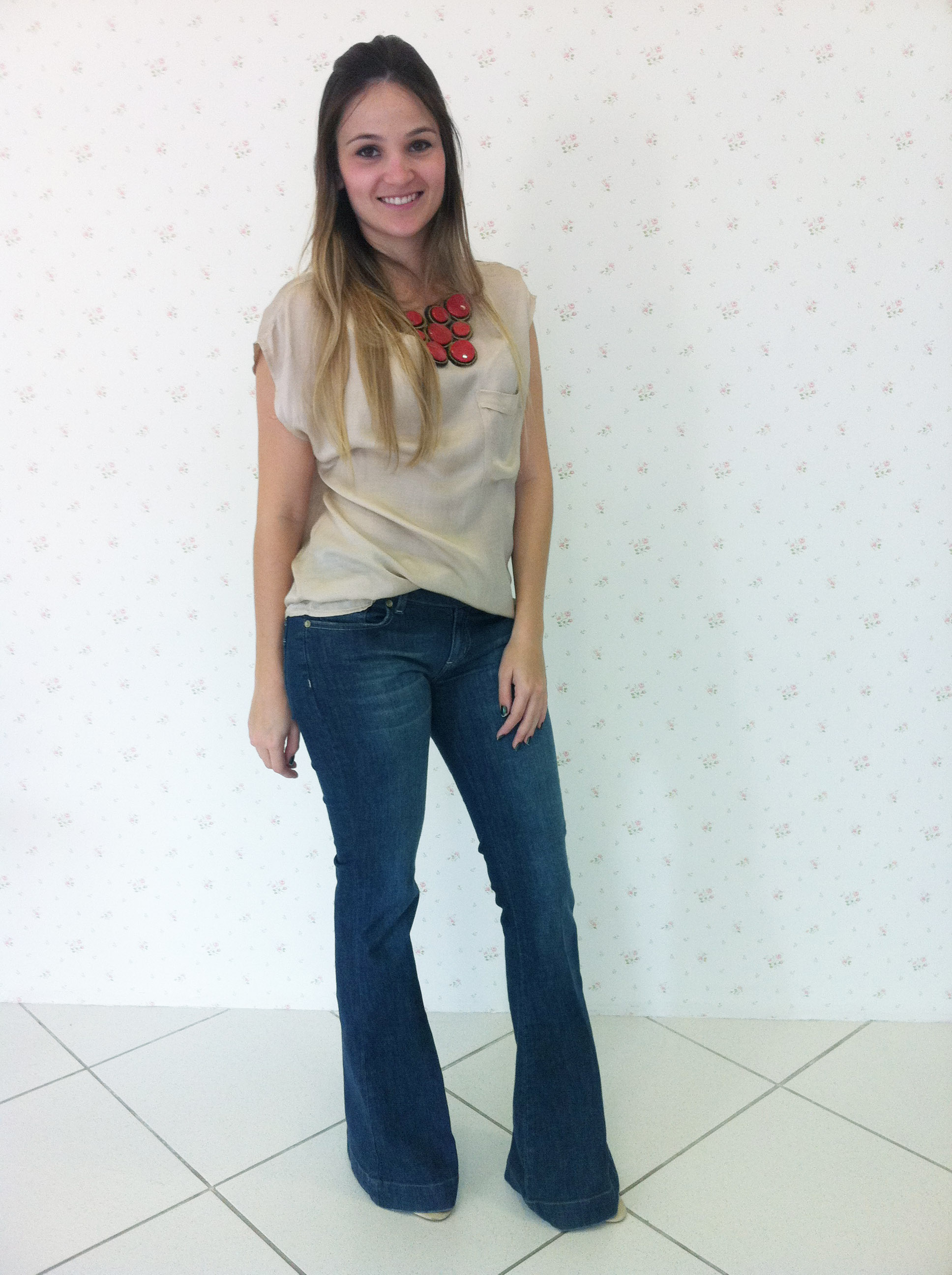 No look: Calça flare jeans (minha mais recente aquisição) + blusa de seda nude + maxi colar coral.