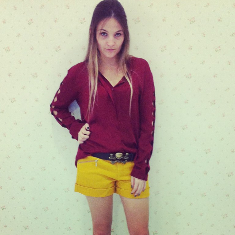 Look 1 – Color blocking invernal: Pra quem achou que a mistura de cores ia desaparecer na estação mais fria do ano, se enganou, podemos abusar do mix de cores. No look: camisa vermelho queimado + short mostarda – cor super em alta nesse inverno + cinto de cabeira.