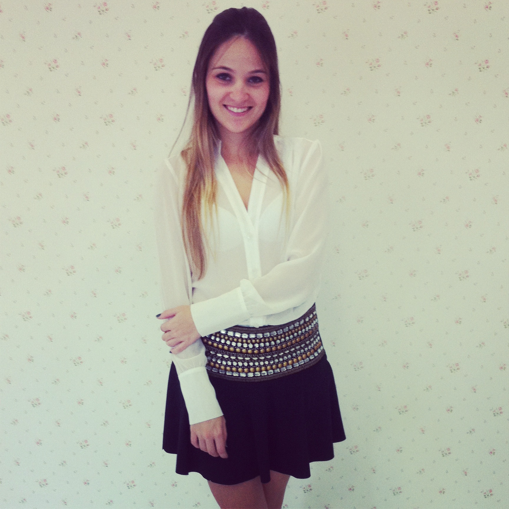 Look 3 – Saia bordada: As peças bordadas dão um charme a mais no look, além de lindas são super chiques, combine-as com camisas. No look: Saia preta com cós bordado + camisa branca com uma leve transparência.