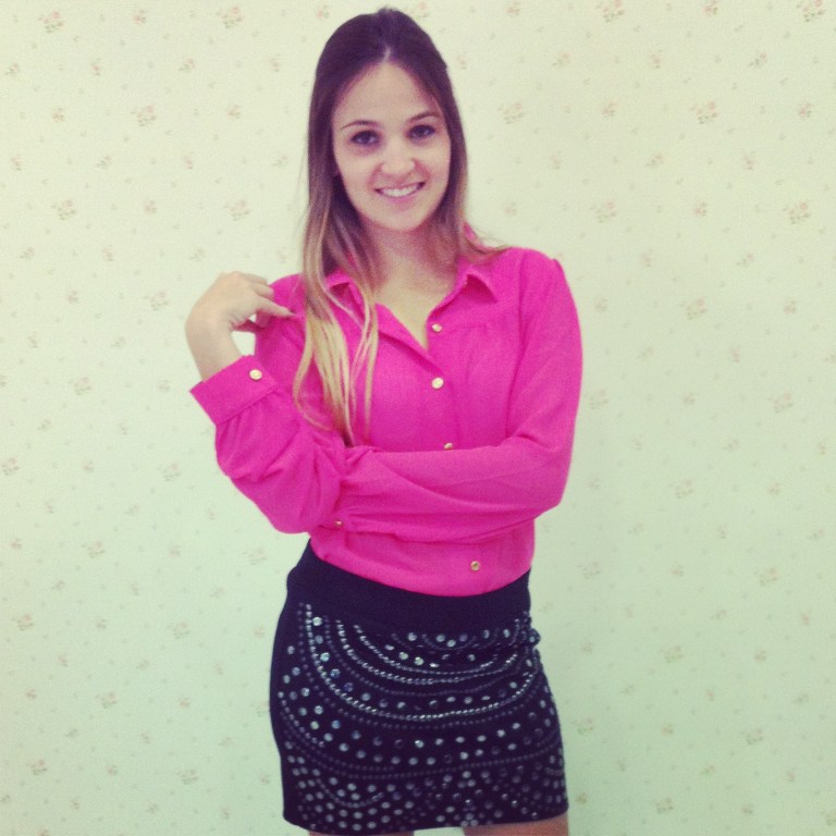 Look 2 – Saia de tachas: Moderna, ao estilo rock girl, apareceu com uma pegada mais delicada. As tachas estão presentes em sapatos, bolsas, jaquetas, etc… No look: Saia preta de tachas + camisa pink. Look perfeito pra arrasar na balada.