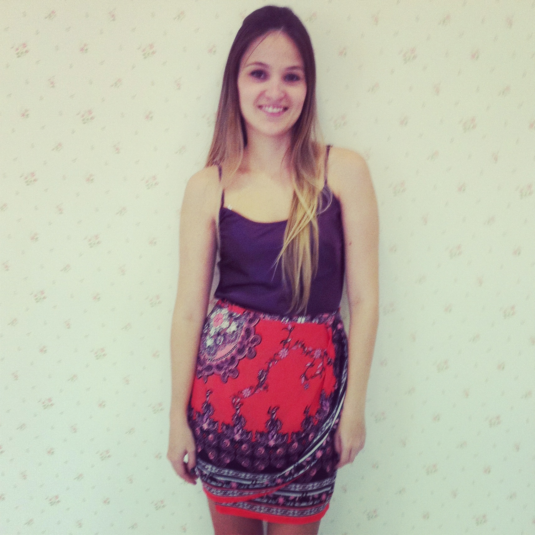Look 4 – Estampa lenço: Depois de Versace, várias marcas se inspiraram e criam peças com estampa de lenço, camisas, calças, vestidos e saias. No look: Saia estampa de lenç0 + regata de cetim berinjela.