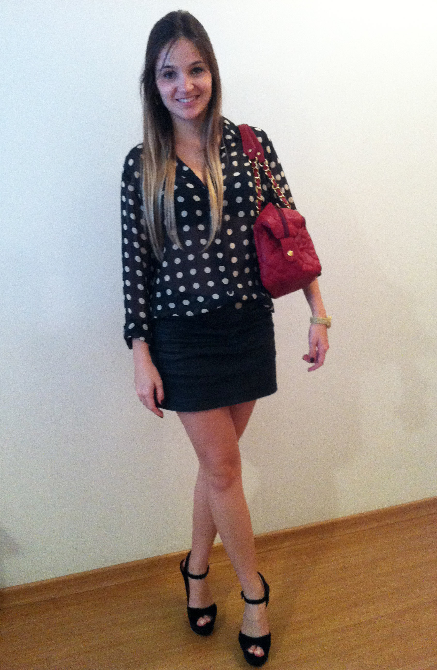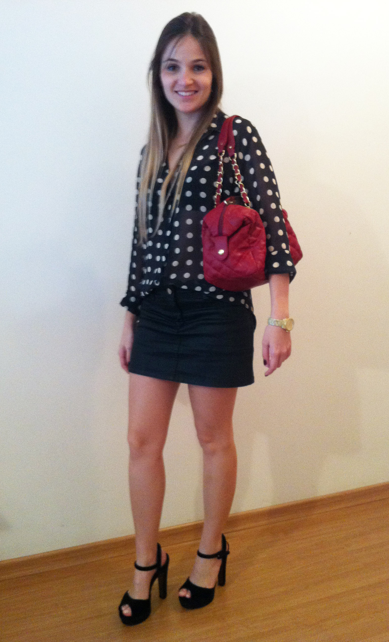 Ontem fui na Costelaria do Bola com minha família comemorar o dia das mães. Como o tempo estava indefinido, nem calor nem frio, optei por uma camisa de poá + saia encerada/resinada + sandália de veludo. O look ficou todo com um ar P&B, pra dar uma quebrada joguei uma bolsa vermelha, adoro essa combinação: preto + branco + vermelho, acho chique. Dica: A camisa é sempre a melhor escolha quando o clima está assim, não tem erro, pois se esfriar você não morre de frio e se fizer mais calor é só dobrar as mangas.