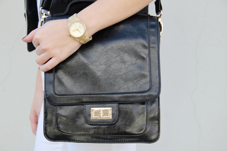 Calça e colete –  Impactto Modas |  T-shirt – Zara | Bolsa – Marisa |  Relógio – Michael Kors |  Óculos –  Ray-Ban |  Sandália – Schutz