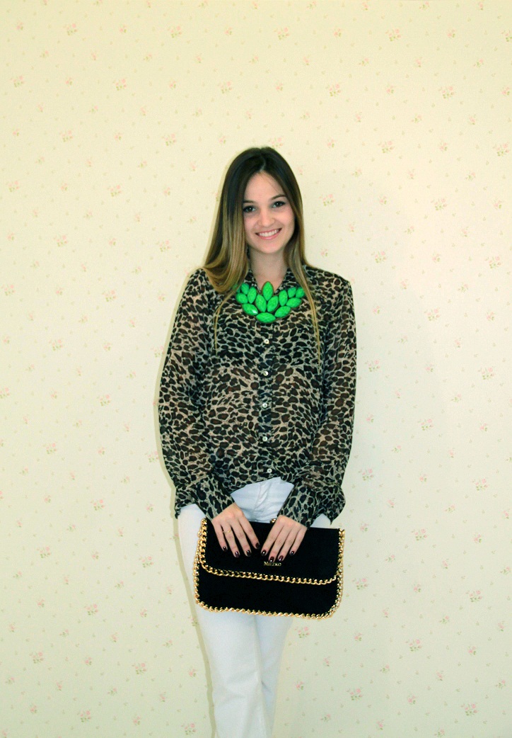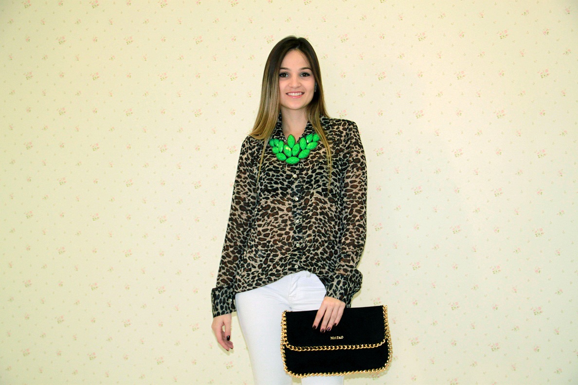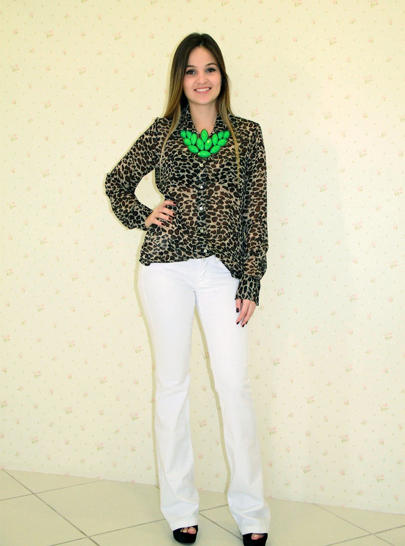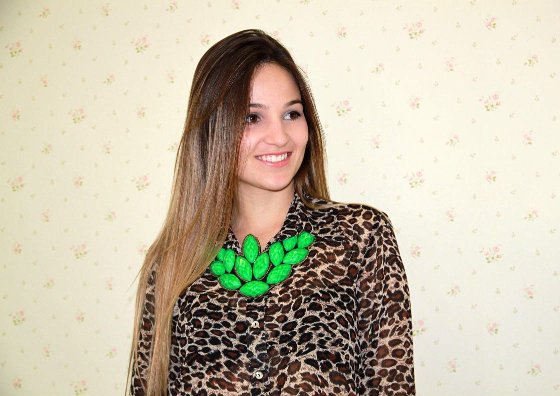 Como por aqui está aquele climinha gostoso, um friozinho bem sútil, dá pra colocar só uma camisa. Mas minha escolha não fui assim tão simples, básica, hehehe… Coloquei uma camisa maravilhosa leopard print, com uma leve transparência, que deixa sexy na medida certa e pra deixar o look ainda mais baphônico joguei um maxi colar esmeralda, adorei essa mistura, ficou um sucesso!
