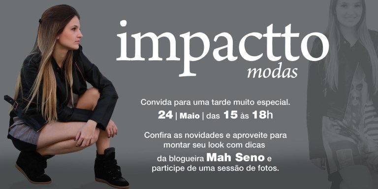 Queridas amigas, leitoras e clientes da Impactto Modas, amanhã (quinta-feira), a partir das 15:00 horas acontecerá um delicioso coquetel na loja, para apresentar as lindas novidades da coleção outono/inverno. Faremos uma sessão de fotos para a FanPage da loja e para o blog, onde as clientes irão escolher e montar seus próprios looks – é claro que vou dar muitas dicas e meus pitacos na produção, hahaha. Todas estão super convidadas para essa tarde mais que especial, com direito a drinks e docinhos para as clientes!