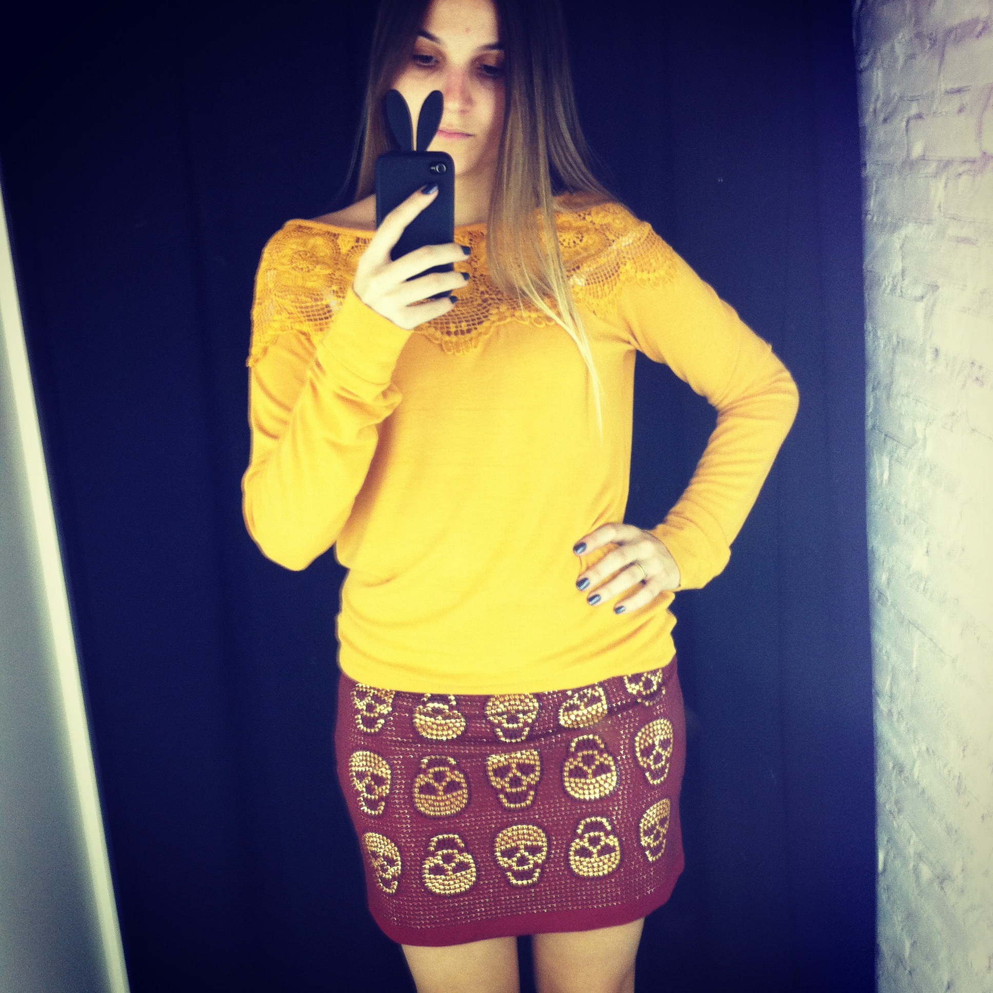 Assim que chegou essa saia de caveiras na Impactto Modas meus olhos brilharam, hahaha foi amor a primeira vista!! Queria ela pra mim, pena que não serviu, snif… =(