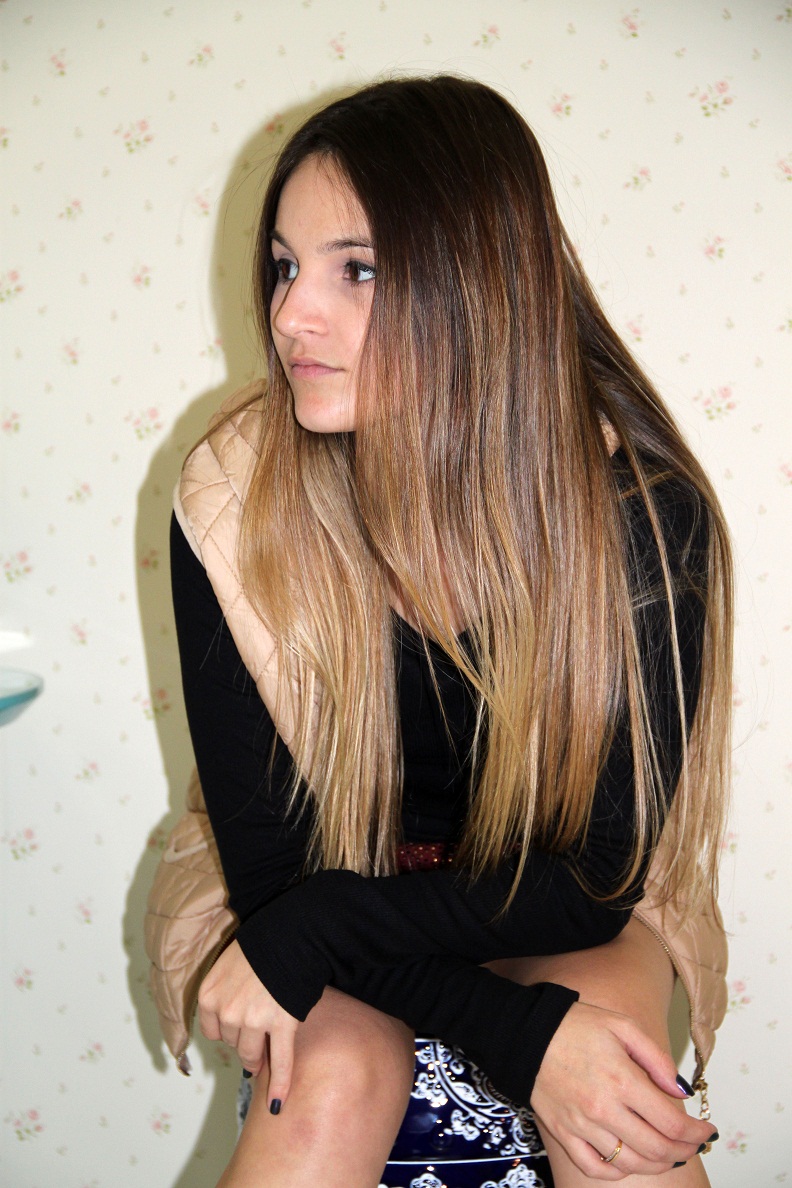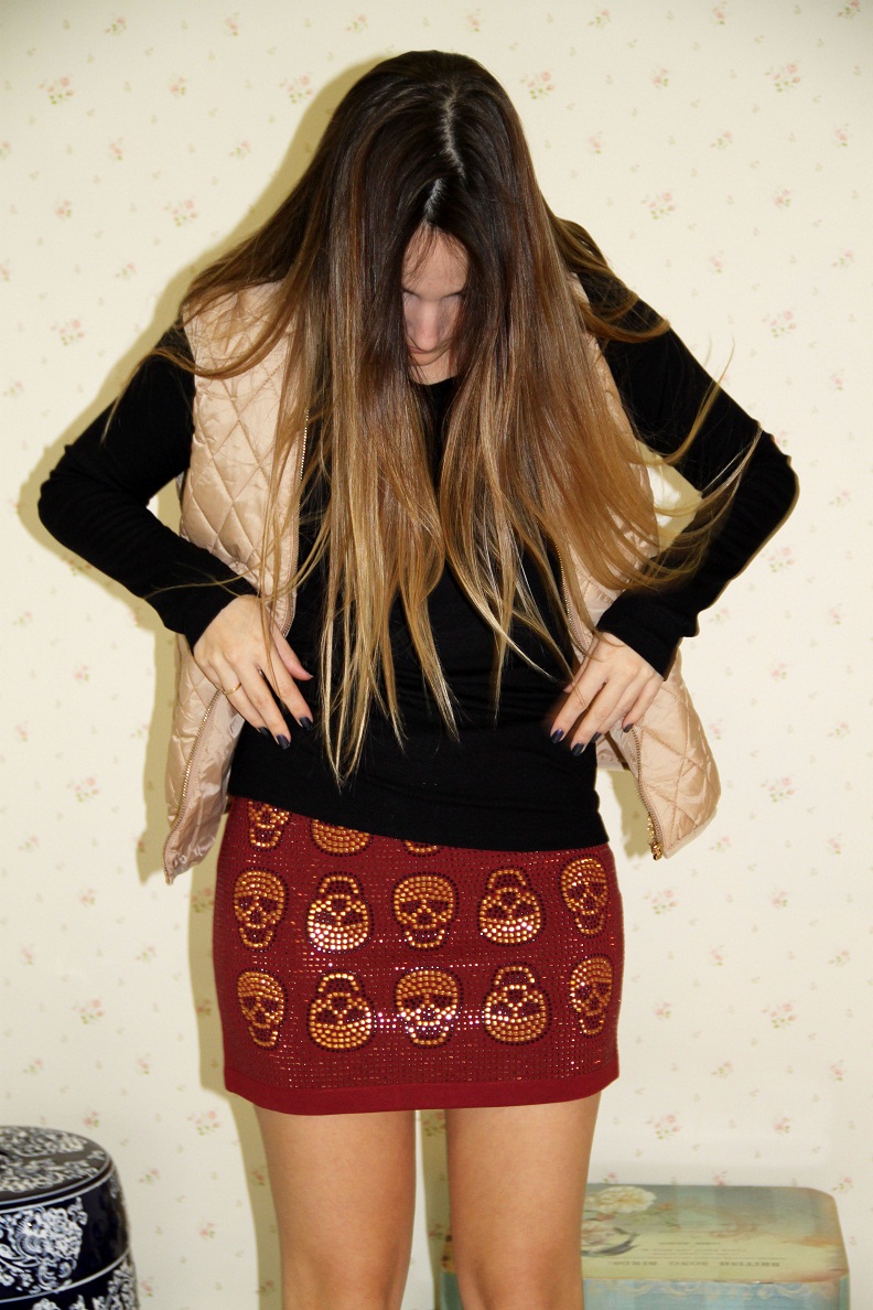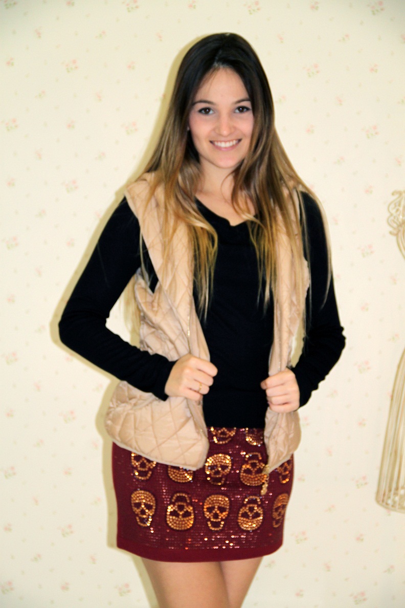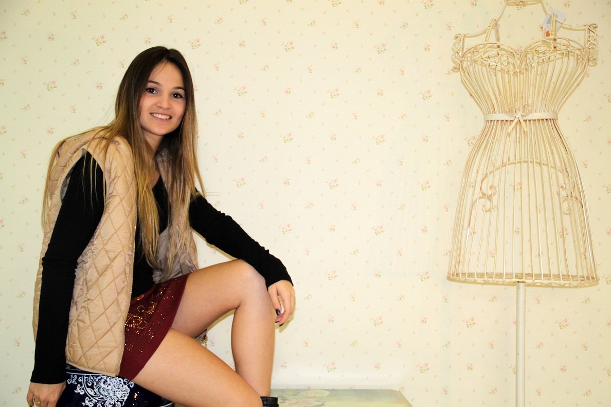 Escolhi uma blusa de manga longa preta mais básica, afinal a saia já é super chamativa e ousada, quis deixar todo brilho do look focado nela. E pra dar aquele ar despojado e mais moderno joguei um colete de matelassê bege, que deixou o look com aquela pegada esporte chic.