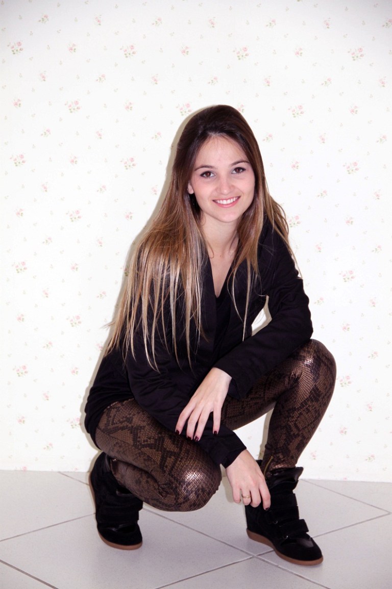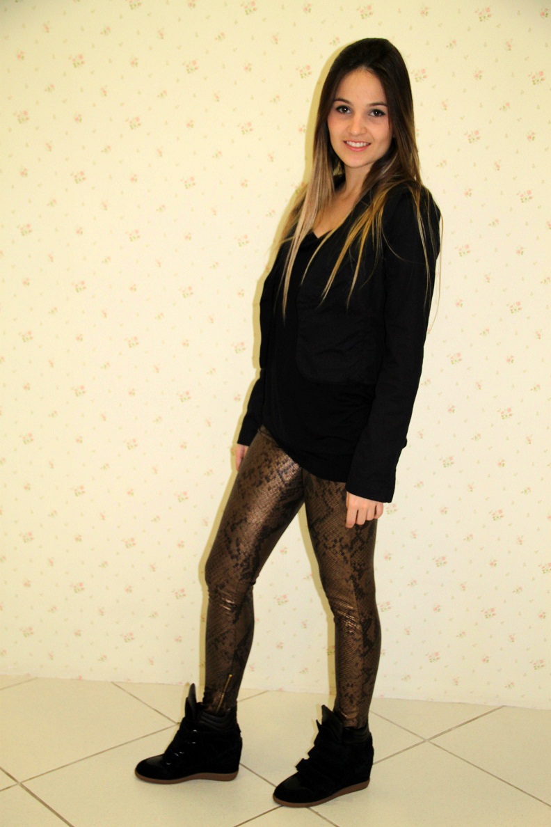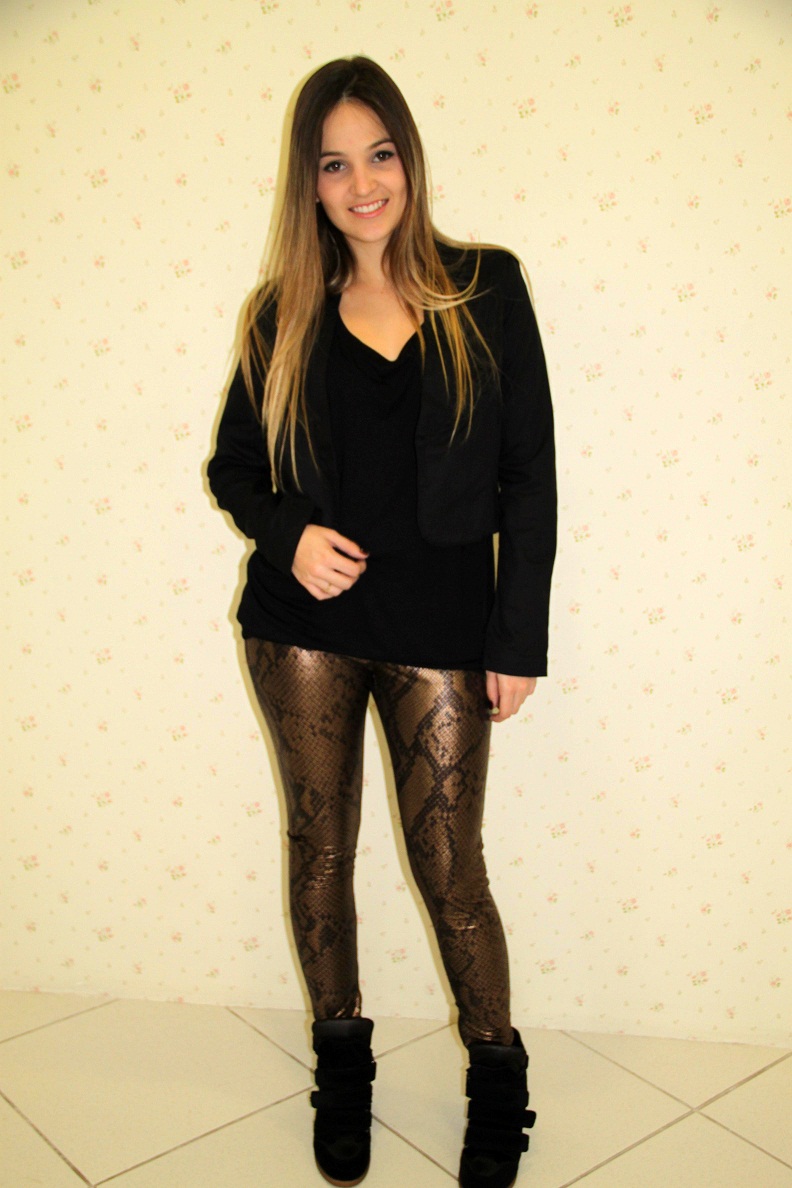 A peça-chave da vez foi a legging snake print metalizada. Nossa, só o nome já dá um medo, né? Legging + snake print + metalizado?! Vocês devem estar imaginando um look “a la Theodora”, ou no mínimo Val Marchiori, mas não é nada disso… Peguei a calça que tem uma estampa super chamativa e ousada, difícil de combinar e misturei com peças básicas, neutras, bem despojadas e o resultado ficou demais, eu adorei… Quebrou aquele ar “sensual” da legging e deixou o look ultra fashion e atual.