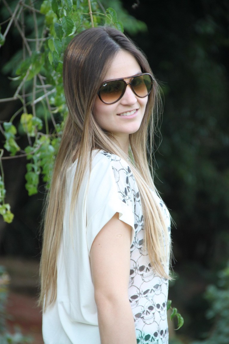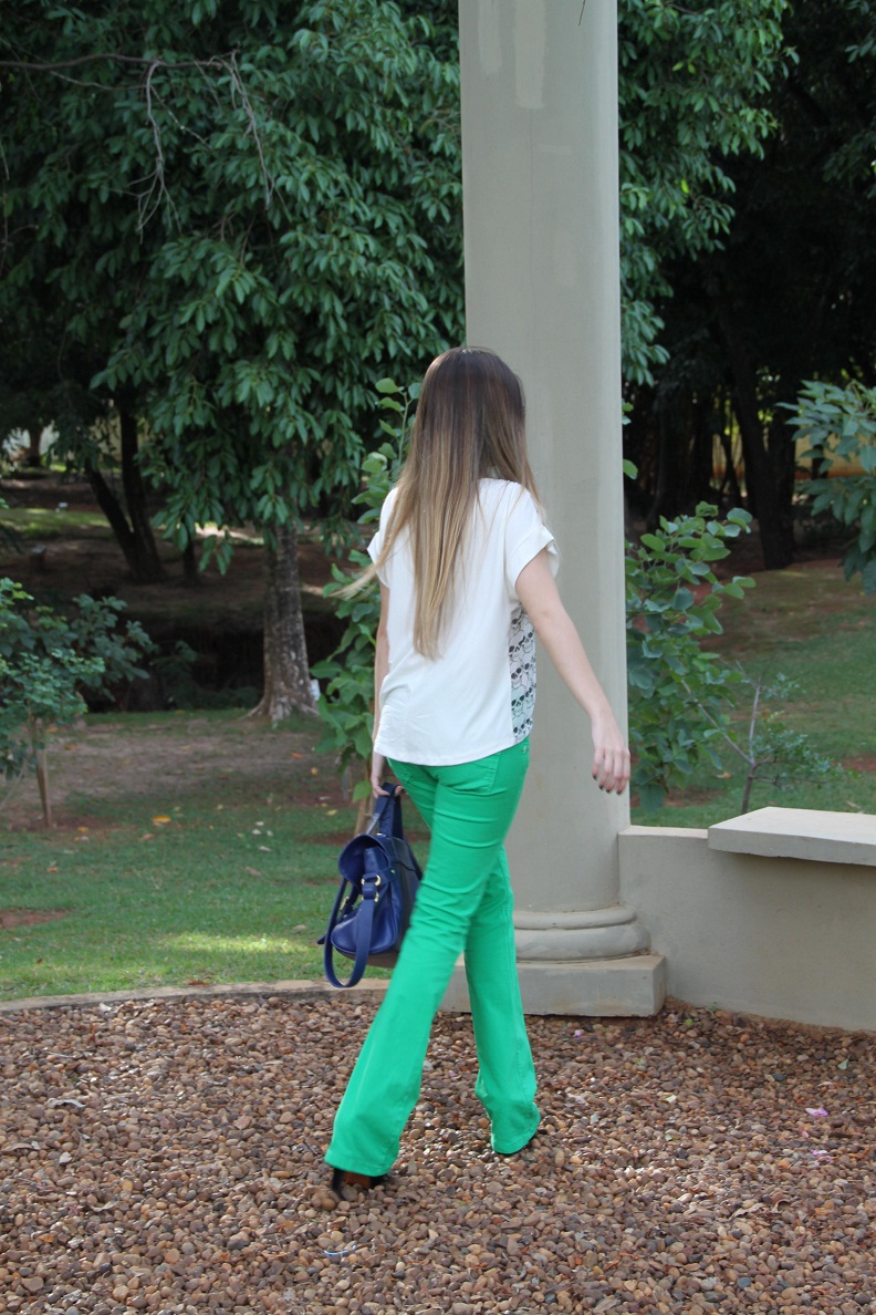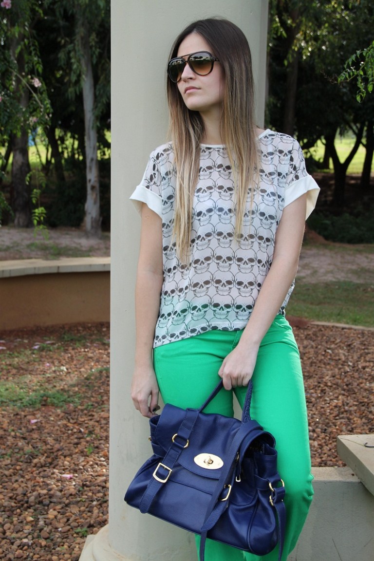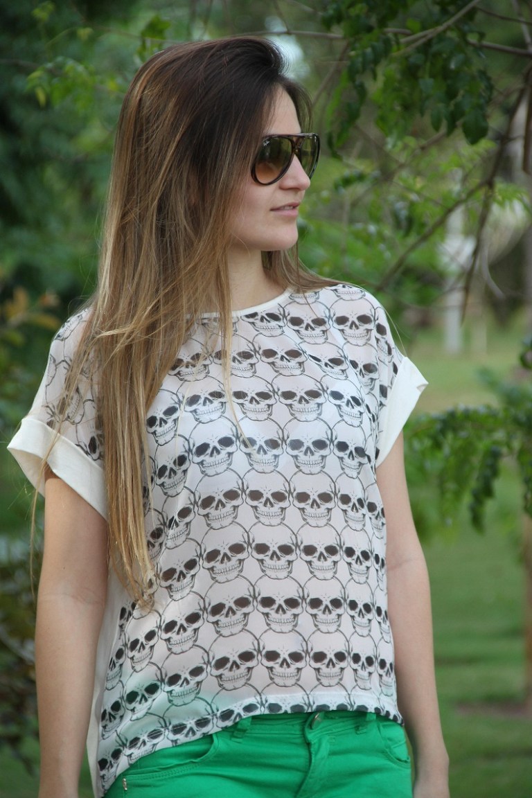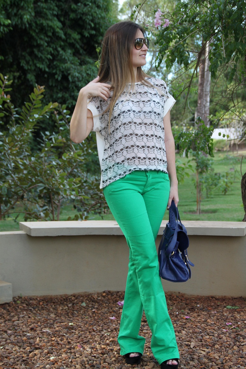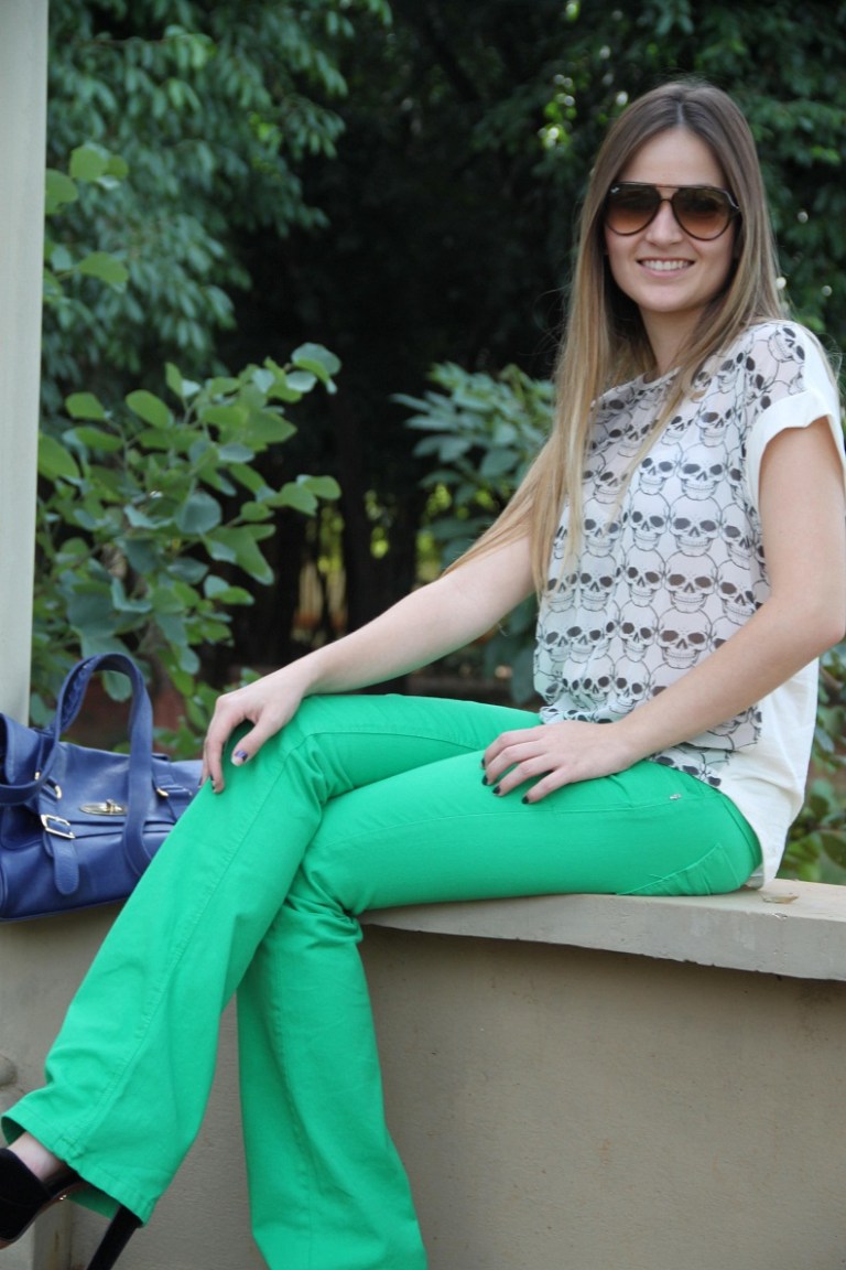 Sabe aquele look que você olha e se apaixona?! Assim que compra não vê a hora de usar… Foi exatamente isso que aconteceu quando vi essa calça verde + blusa de caveiras, amei, fiquei “in love“. Faz um tempão que estava procurando uma calça nesse tom de verde, mas todas que eu encontrava não vestiam bem… Eis que chegou na Impactto esse modelo jeans flare, e é lógico que não pensei duas vezes e arrematei.
