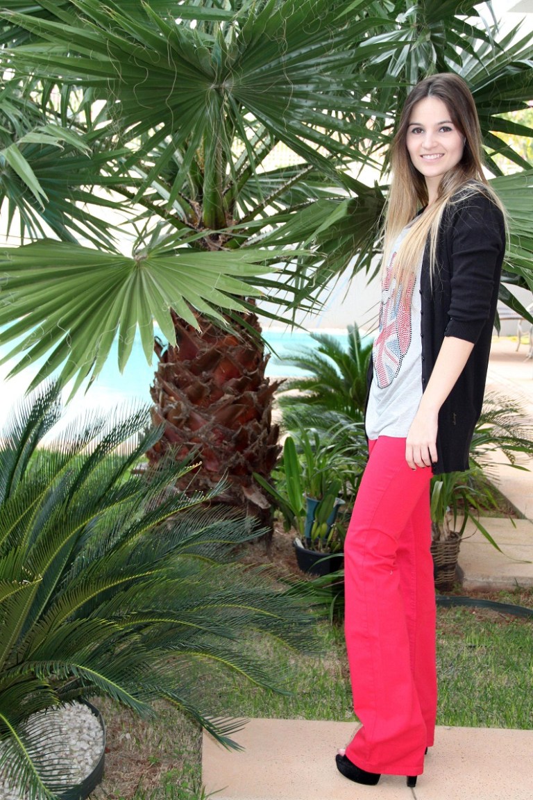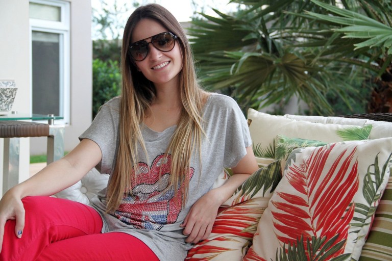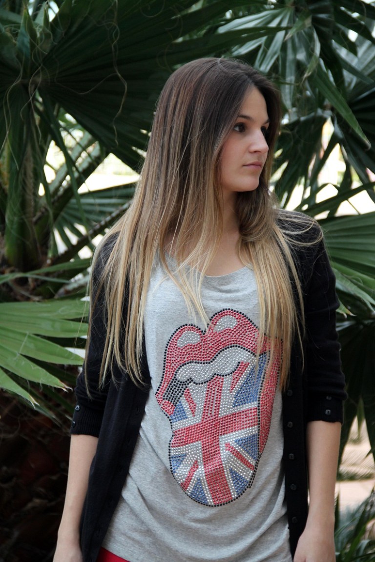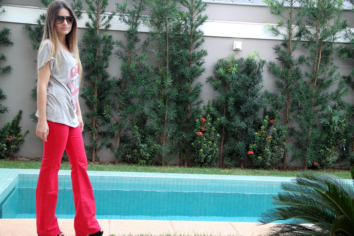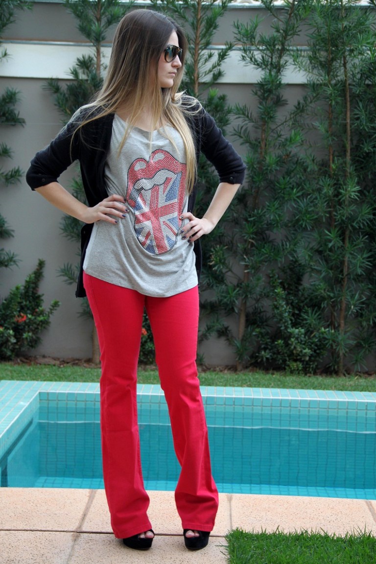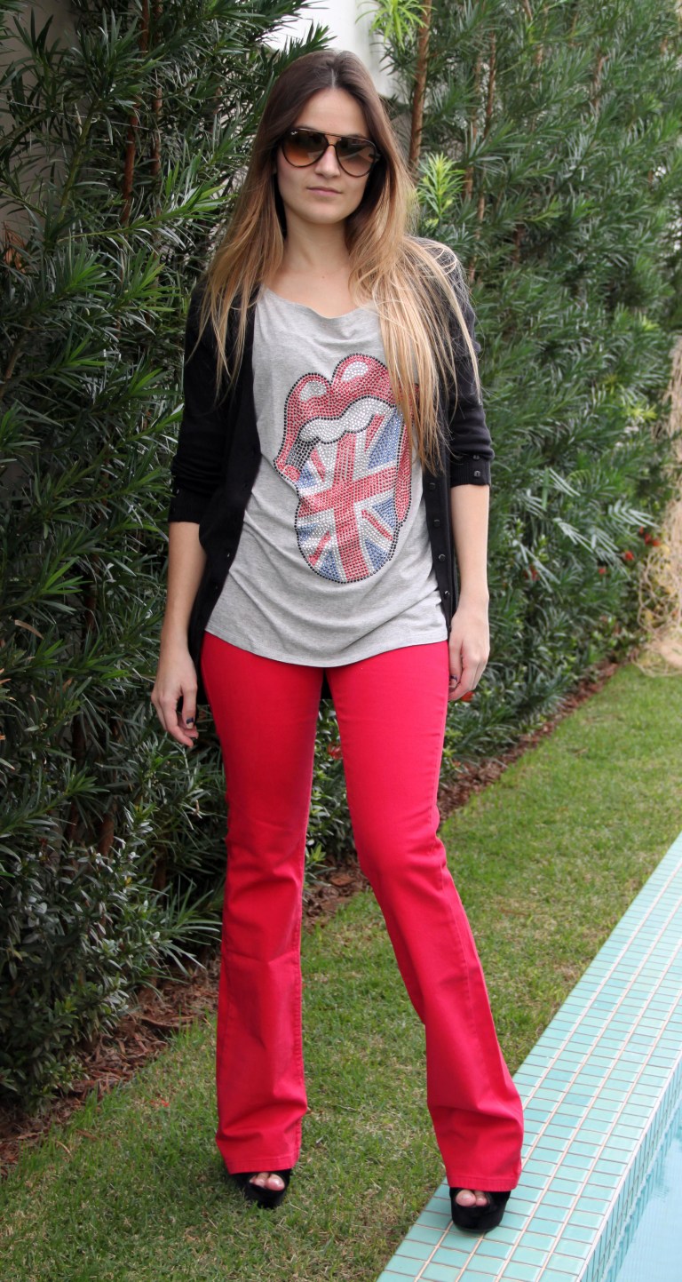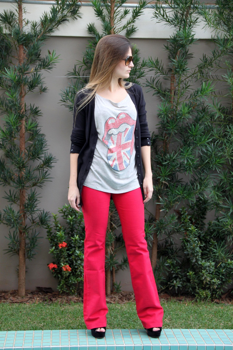 Lembram que um dos temas do quadro We Luv quando participei foram as camisetas de banda? Elas são divertidas e modernas, estão super na moda e deixam o look mais descolado e alegre. Uma das mais famosas é a de boquinha, dos Rolling Stones. Chegaram várias cores na Impactto Modas, preta, marrom, marinho, vermelha, e a que eu escolhi pra montar o look – a cinza – coloquei com uma calça flare vermelha e um cardigã preto.