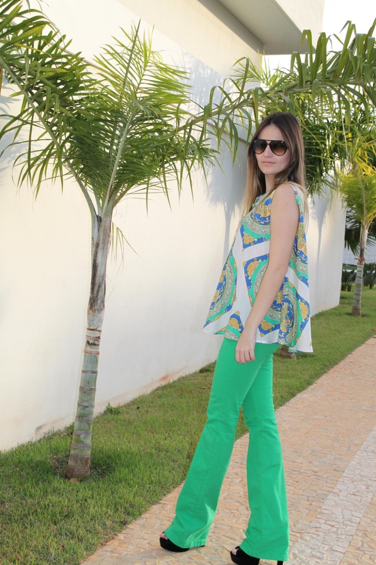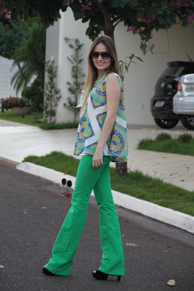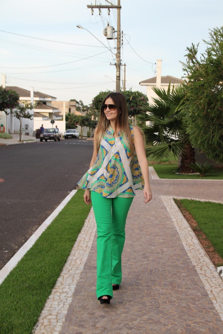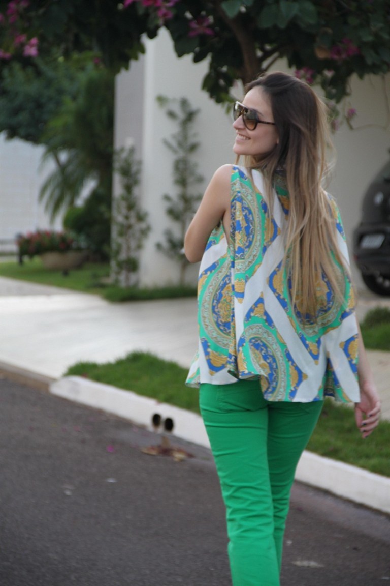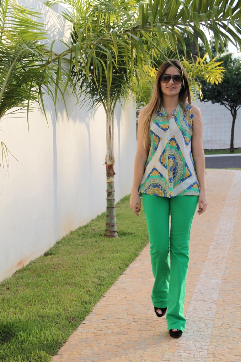 Escolhi uma blusa com a estampa de lenço para compor o look. Mesmo estando no inverno, hoje o dia está mega ensolarado, então optei por um look mais “verão”, alegre, colorido. A estampa da blusa e a cor vibrante da calça deram super certo!