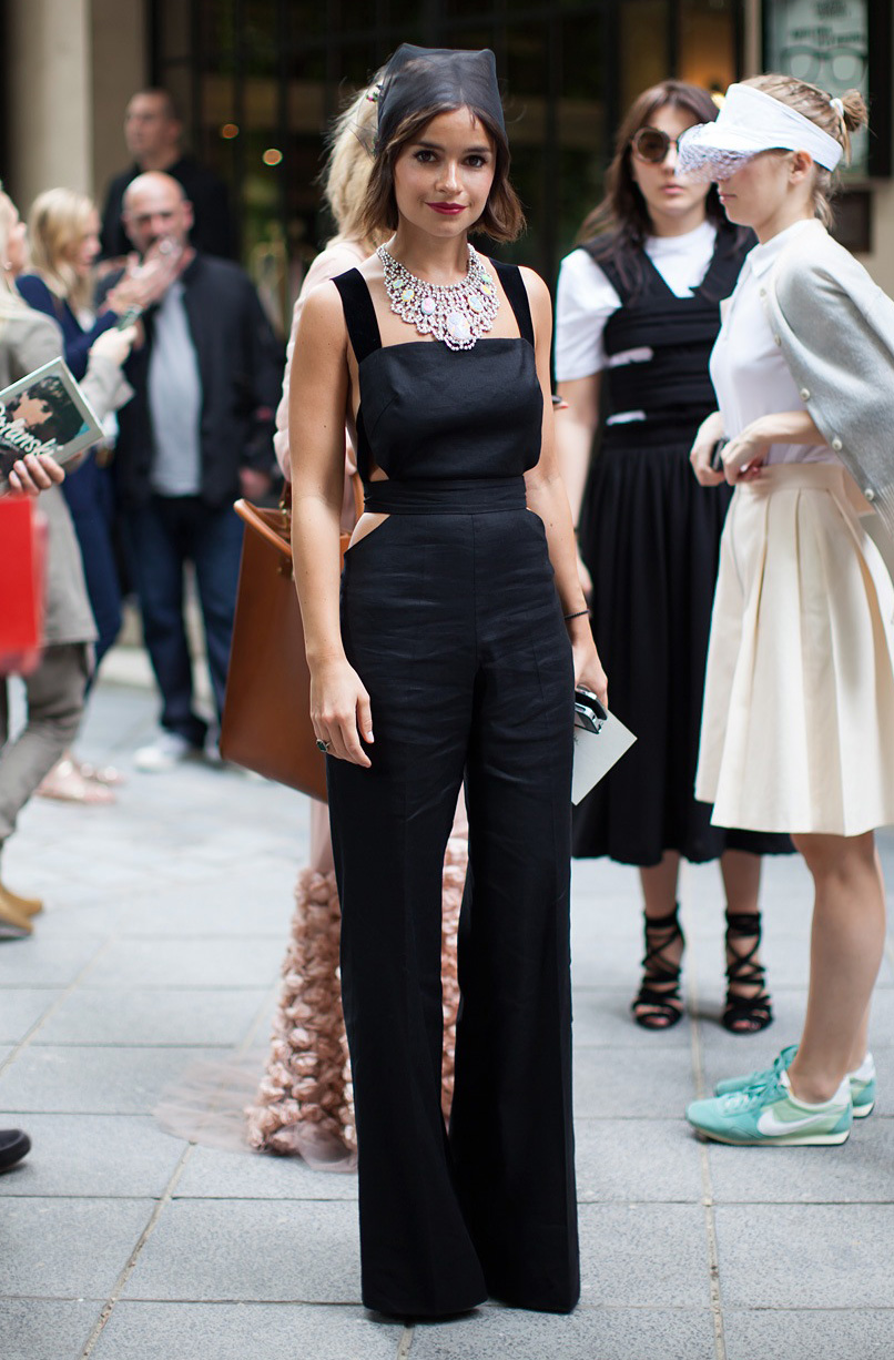 1. essas mulheres que querem ser “fashion” demais sempre caem na breguice! péssimo essa macacão (olhando de frente nem tanto), sem falar no lenço empregada style…só gostei do colar.