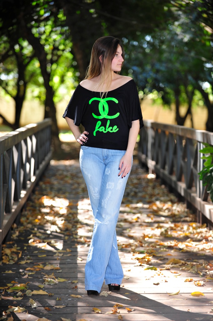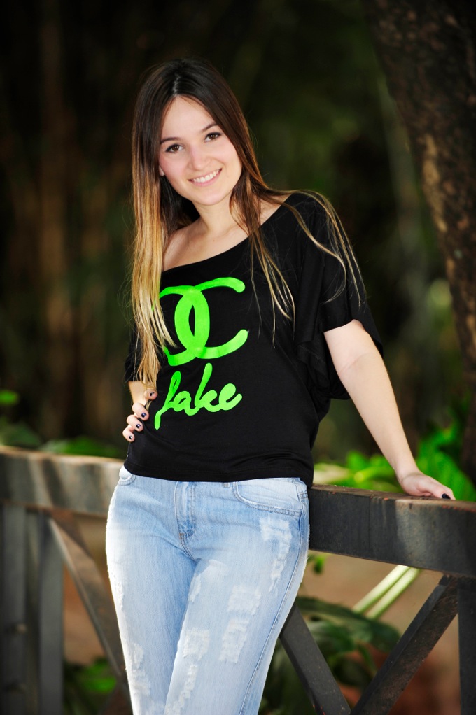 Hoje me empolguei e resolvi mostrar outro look da Impactto Modas. Parece que essa moda “inspired” pegou. A blusa do look de hoje é bem divertida, traz a logomarca da Chanel e a palavra “fake” hahahaha… Criatividade a mil. Eu achei super bacana e criativa, um jeito divertido de mostrar a inspiração…
