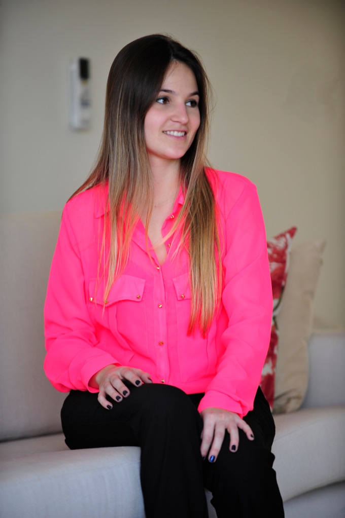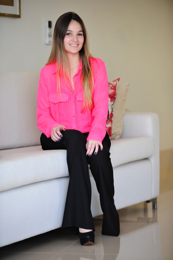 A calça flare já mostrou que além de linda, veste super bem, alongando a silhueta e deixa a mulher ainda mais feminina e elegante, nesse look ela aparece em tecido mais fino e social, o que deixa a peça ainda mais chique. A camisa neon é forte tendência da coleção verão 2013 e dá brilho e glamour ao visual.