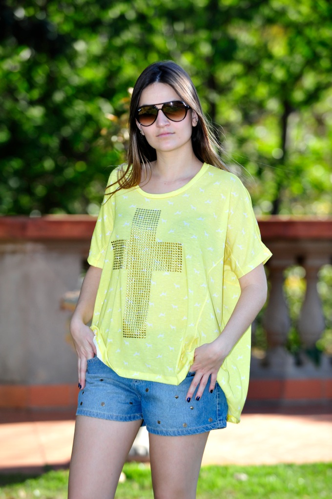 O look da Impactto Modas de hoje é bem cool e moderno, shortinho jeans com tachas + blusa amarela com cruz toda bordada de tachinhas. No verão 2013 as tachas e spikes prometem marcar presença em tudo, roupas, acessórios e sapatos.