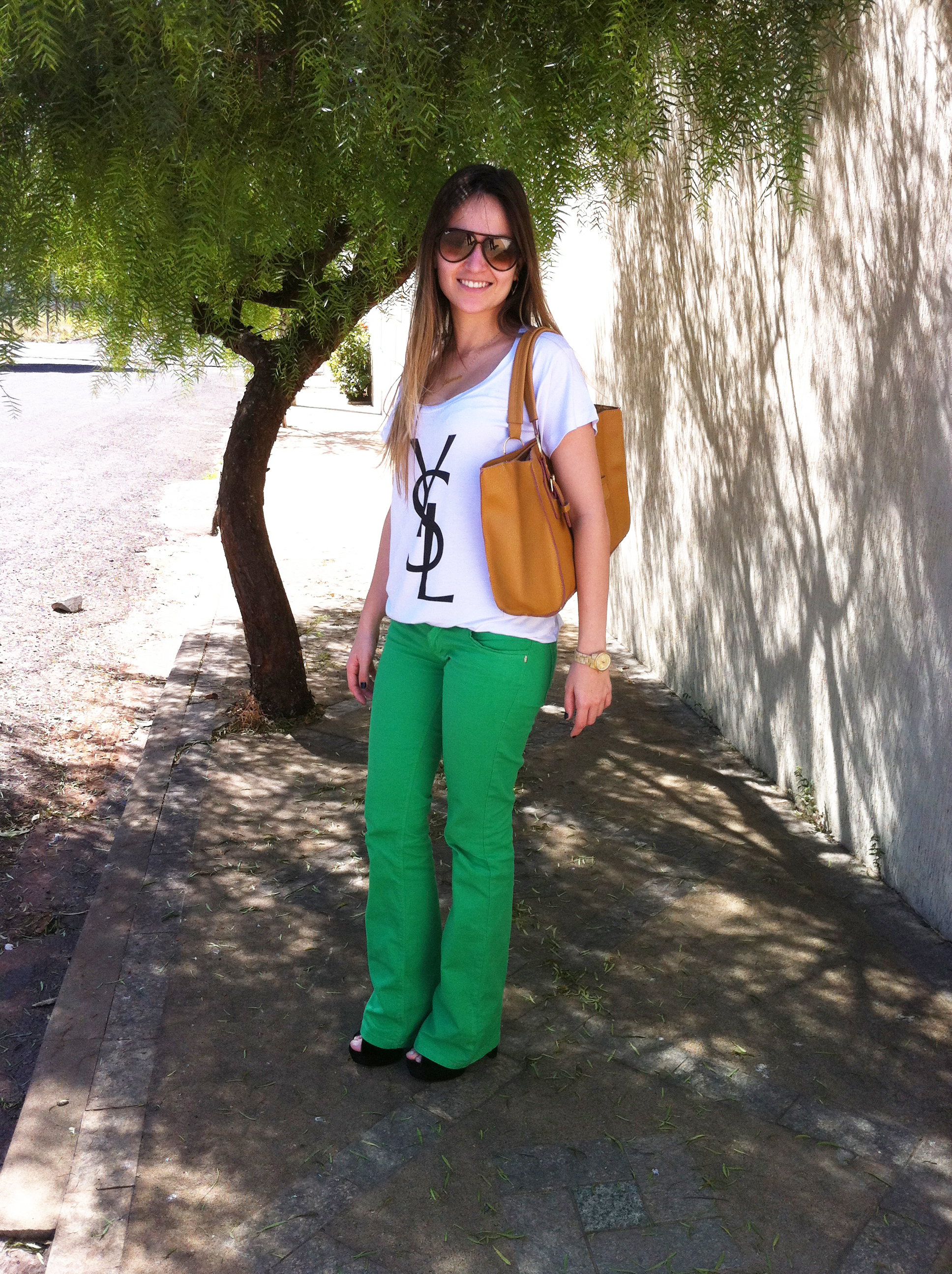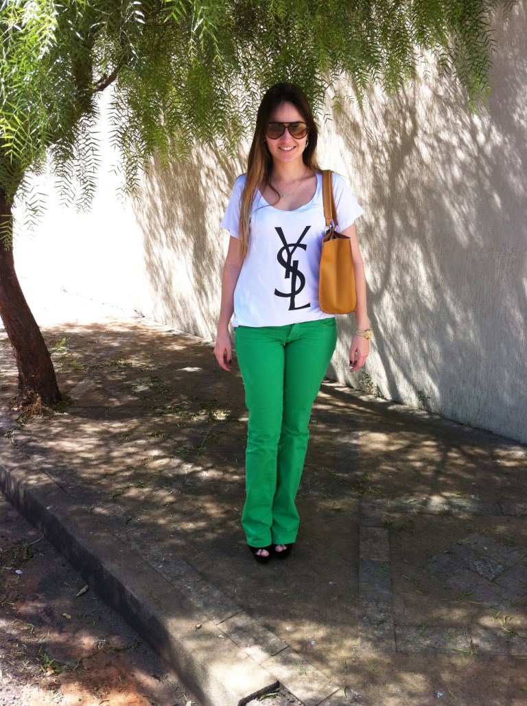 Domingo, dia dos pais, teve um super churrasco em família na casa dos meus avós. Escolhi um look bem básico e despojado, minha calça flare verde bandeira, que eu adoro e minha mais recente aquisição, a t-shirt YSL inspired. Achei que a proposta ficou bem casual, sem perder o estilo.
