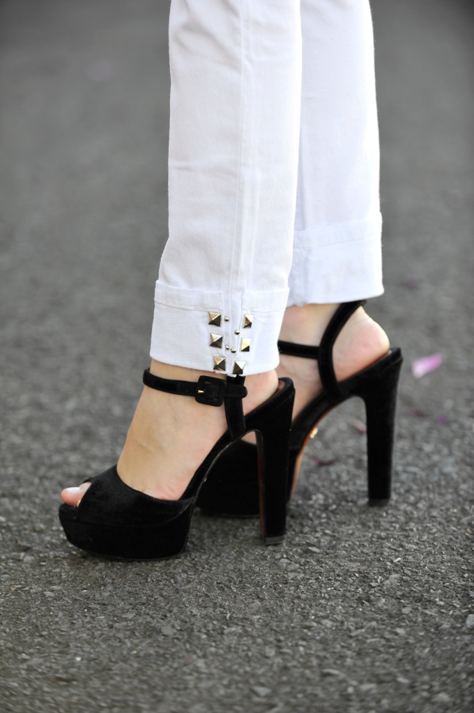 A calça cropped possui a barra mais curta  e o bacana é usá-la com a barra levemente dobrada, deixa super charmoso. Nesse modelo a barra tem aplicação de tachas nas laterais, achei demais. Vejam os detalhes.