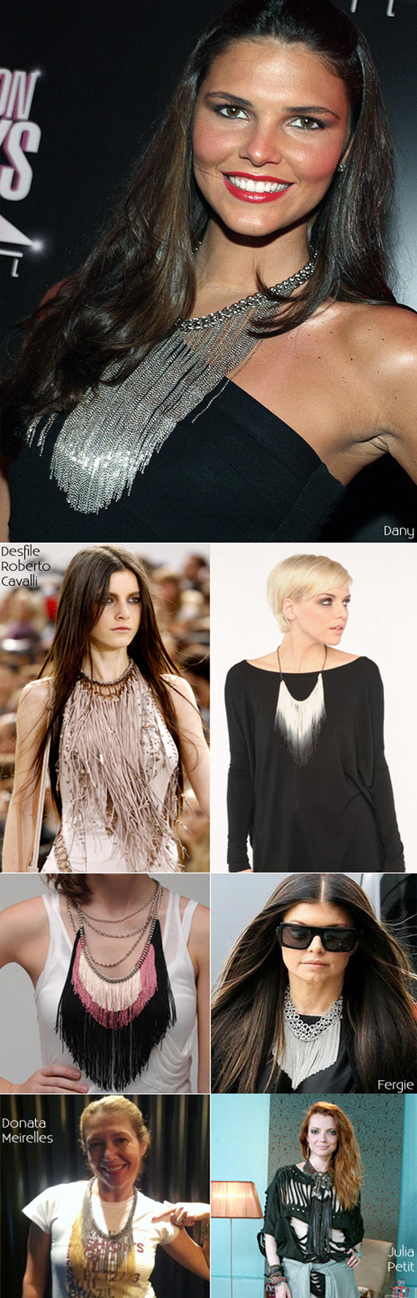 Para um ar mais sofisticado as franjas são usadas em colares, geralmente de metais ou mesmo clutchs com franjas de metais… O couro e o chamois também são usados em algumas peças e conseguem dar esse ar de sofisticação sem perder a inspiração hippie.