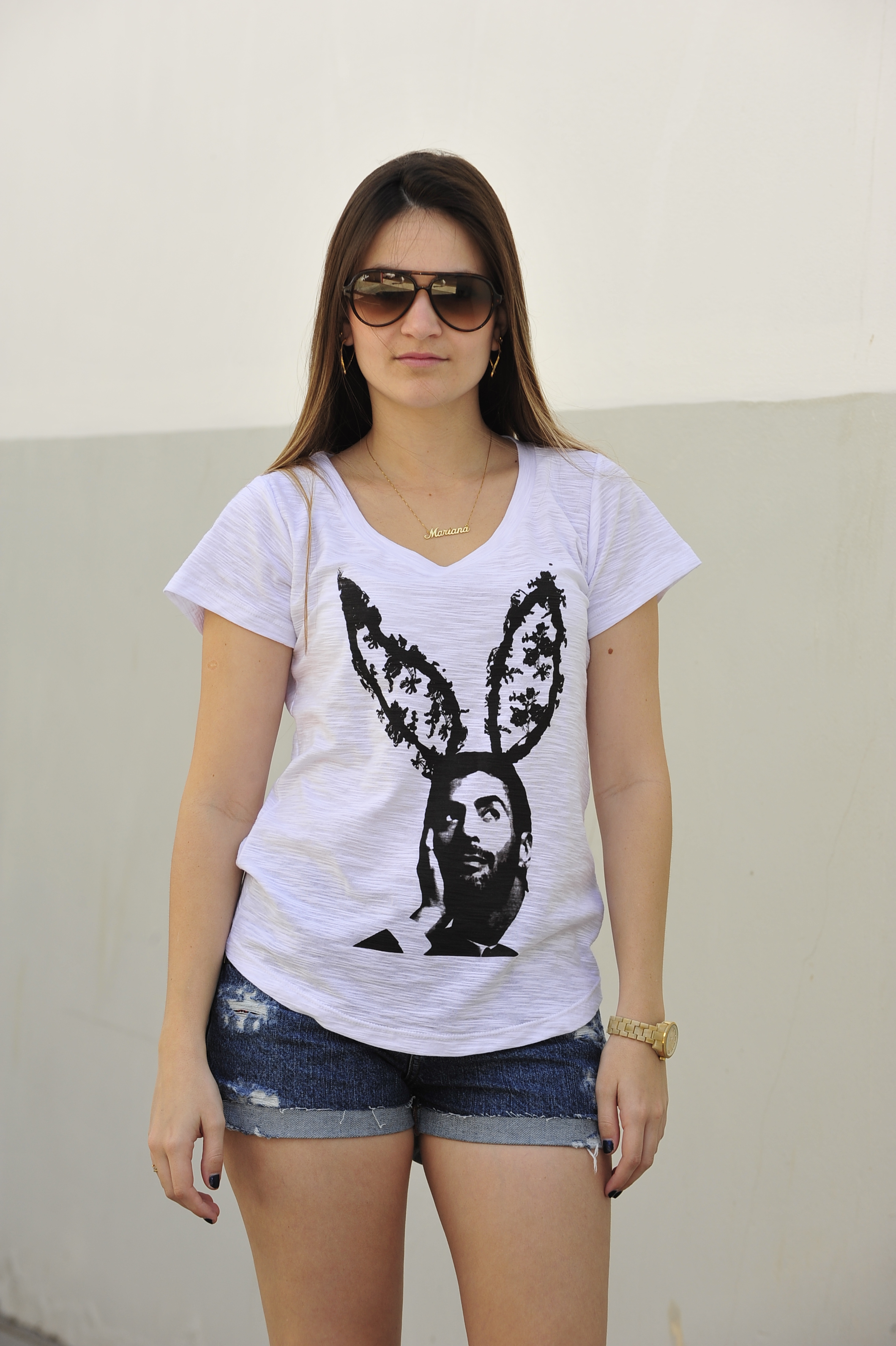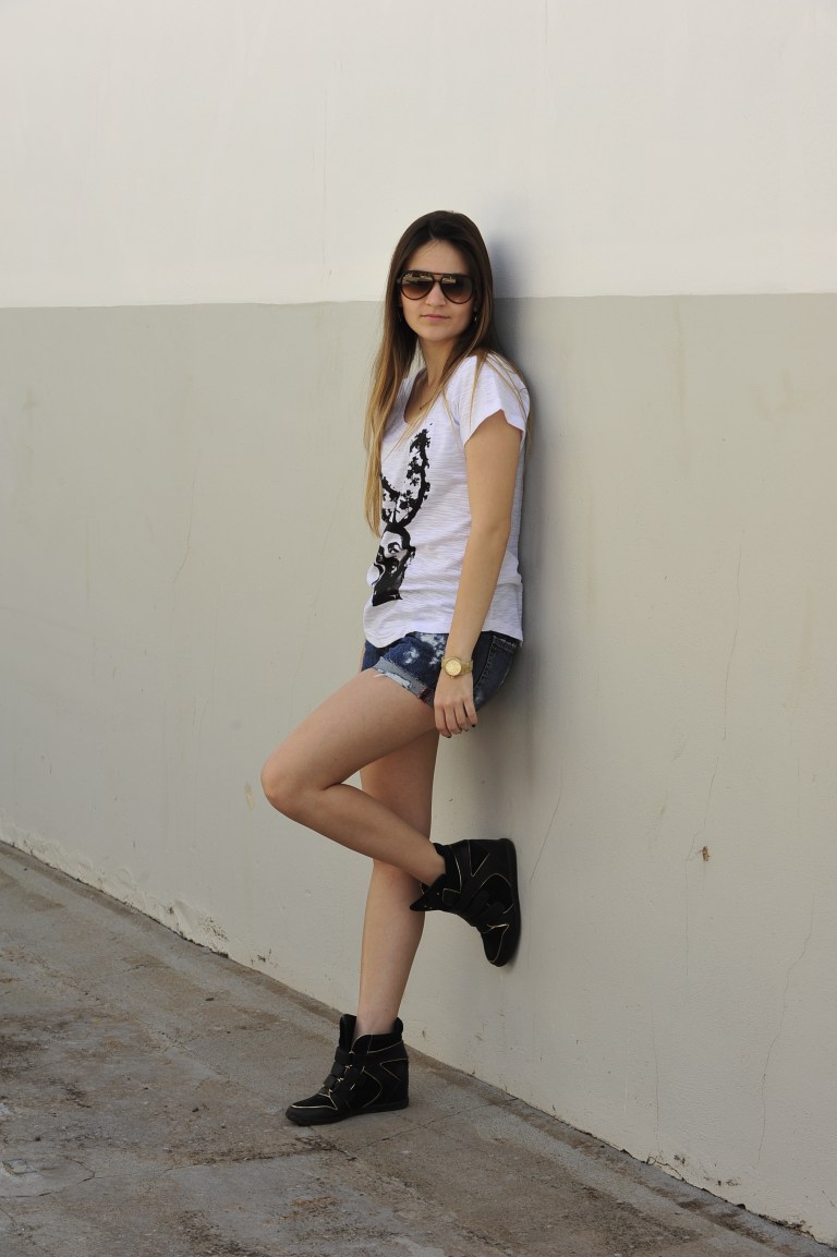 Estou in love com as estampas das t-shirts, uma mais linda que a outra, estampas modernas, descoladas, bem bacanas. Como está um calor absurdo aqui, coloquei um short podrinho/detonado + t-shirt Marc Jacobs + sneakers. Ficou um look bem dia-a-dia, básico, porém estiloso e super minha cara.