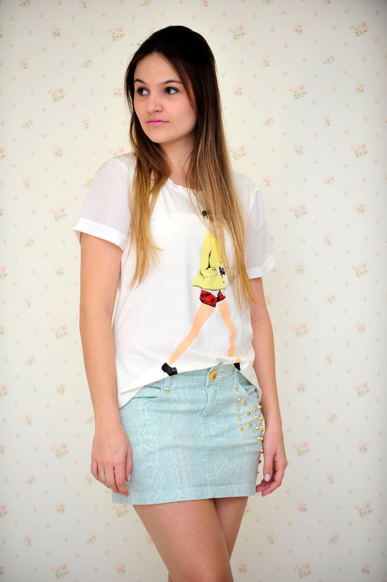 Para começar a semana bem nada melhor que um look Impactto Modas super fashion & cool, não é mesmo!? A produção dessa segunda-feira é com uma saia snake print verde menta com spikes – mesmo modelo desse look que postei aqui – e uma t-shirt super cool. As t-shirts já provaram que vieram pra ficar e que dão charme a qualquer look. Eu uso e abuso delas.