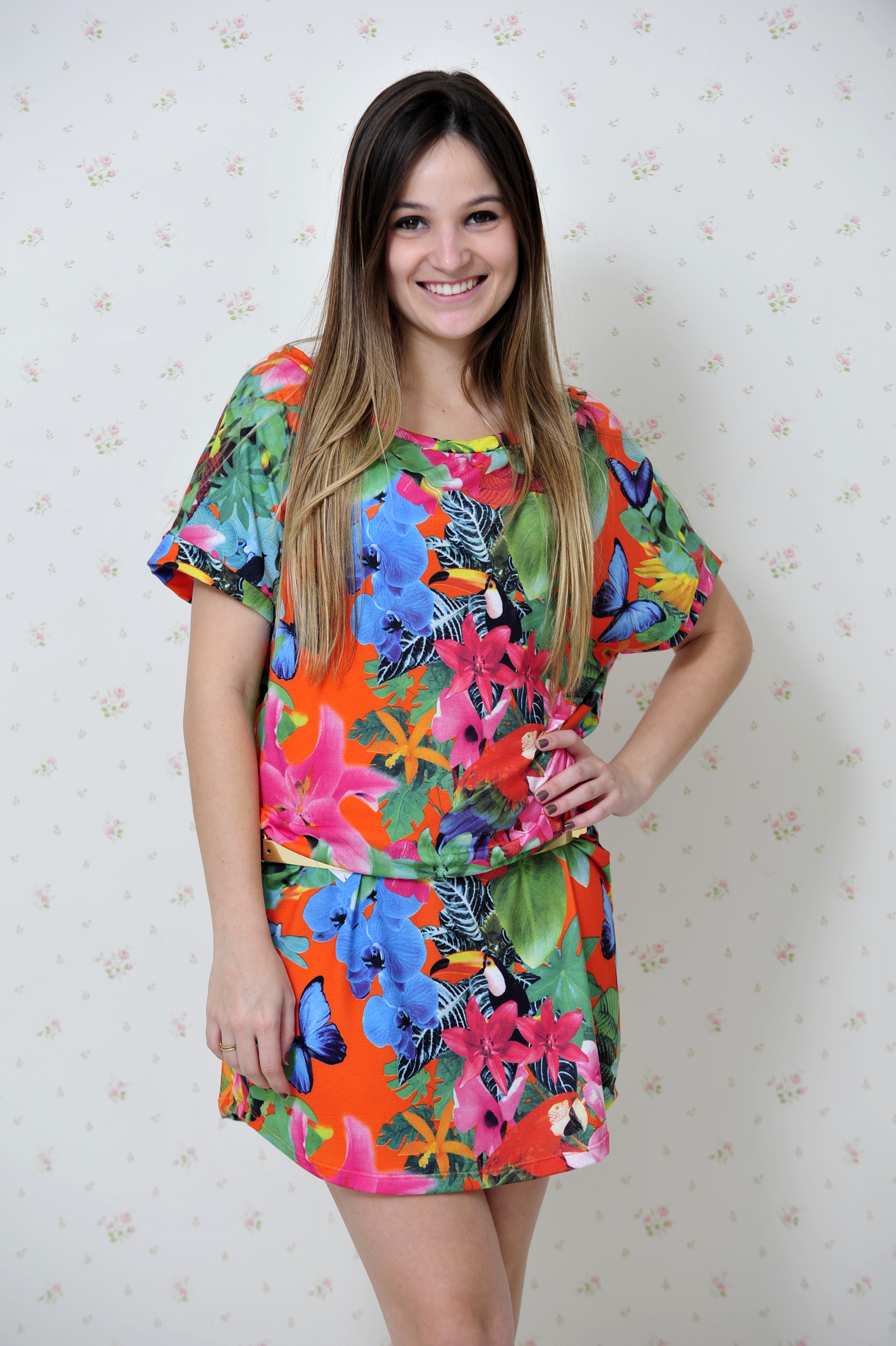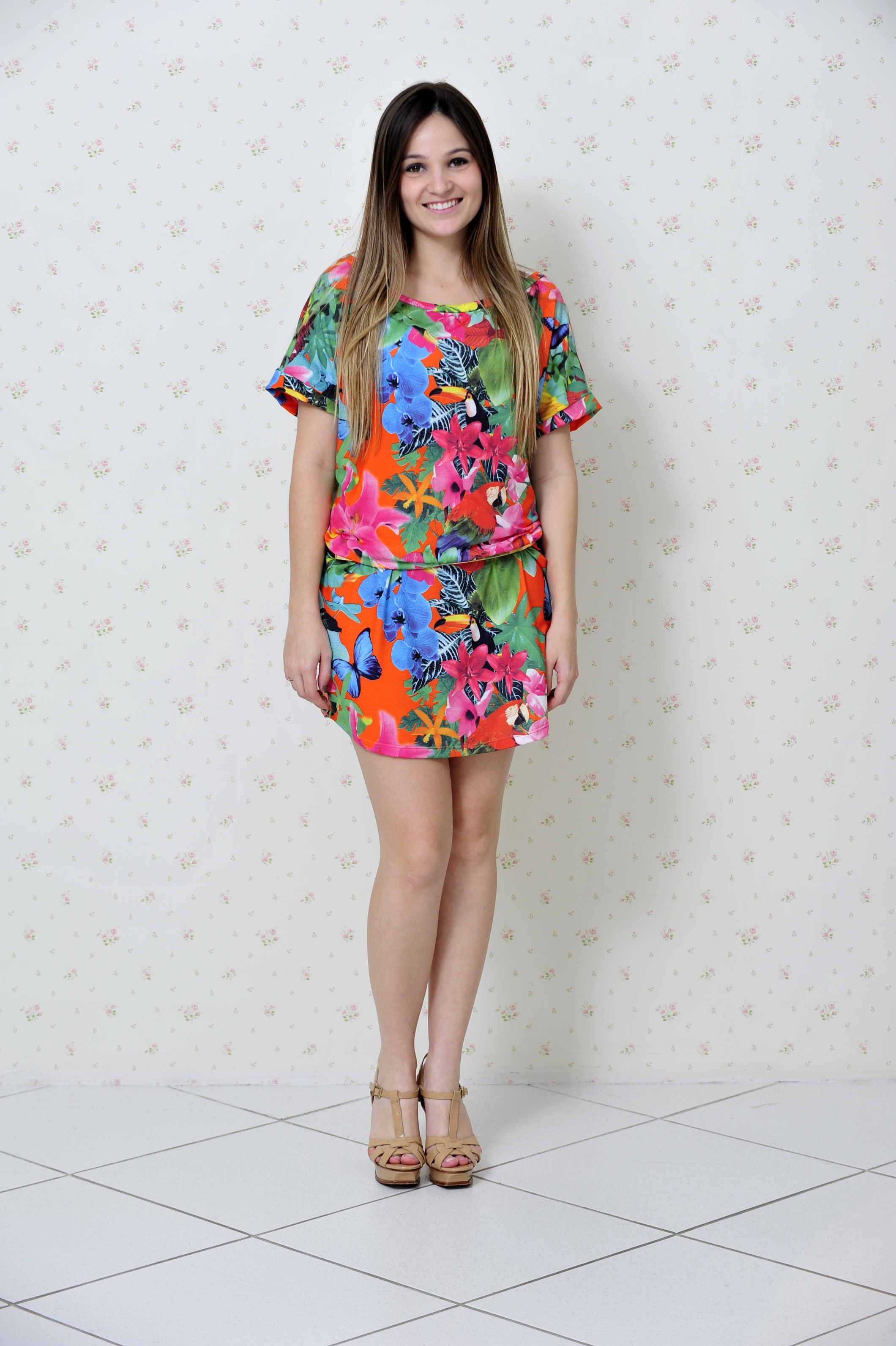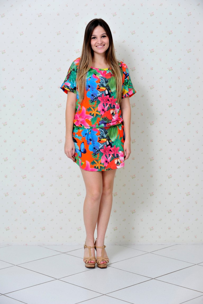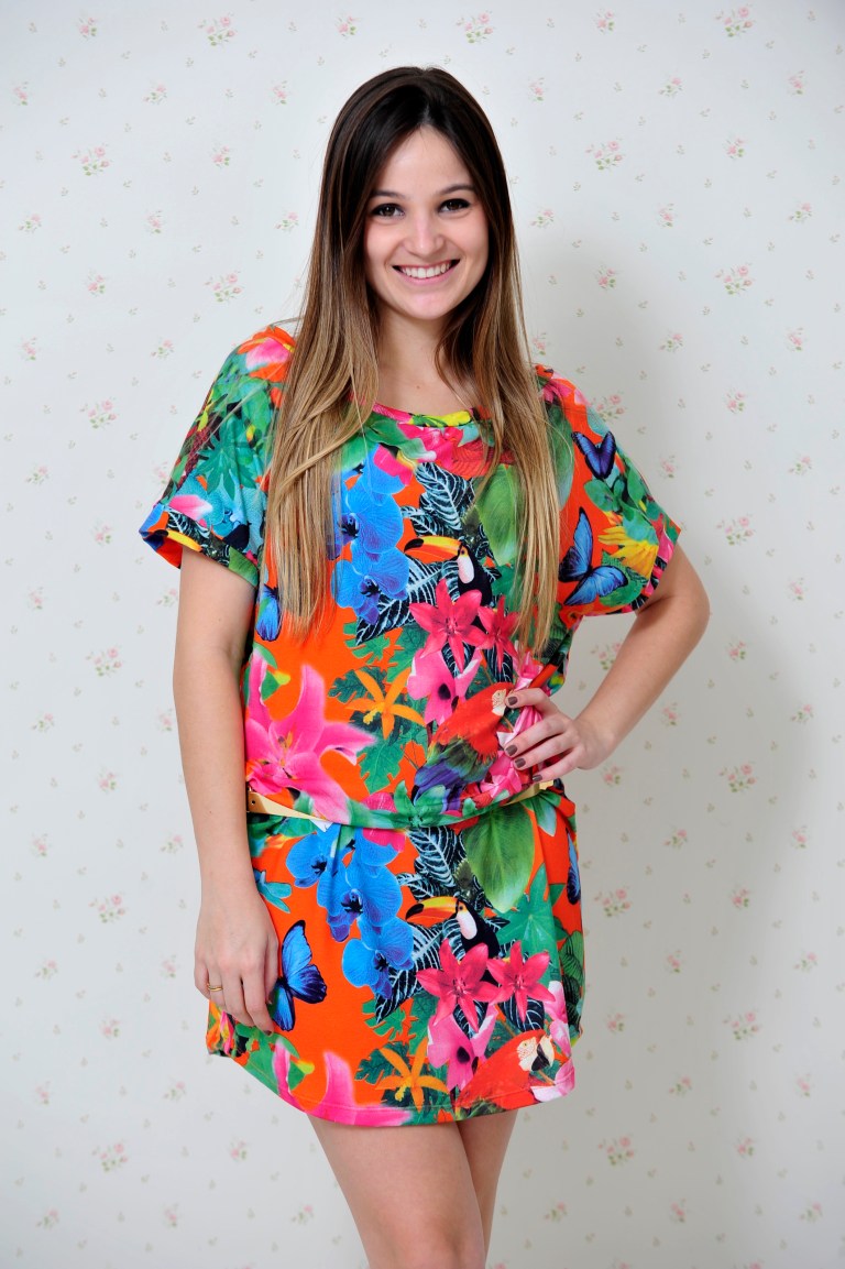 Setembro é a época em que acontece a maioria dos famosos Bailes do Hawaí. E pensando nisso escolhi um look da Impactto Modas que é ideal para essa festa – um vestido com estampa tropical – flores + aves.
