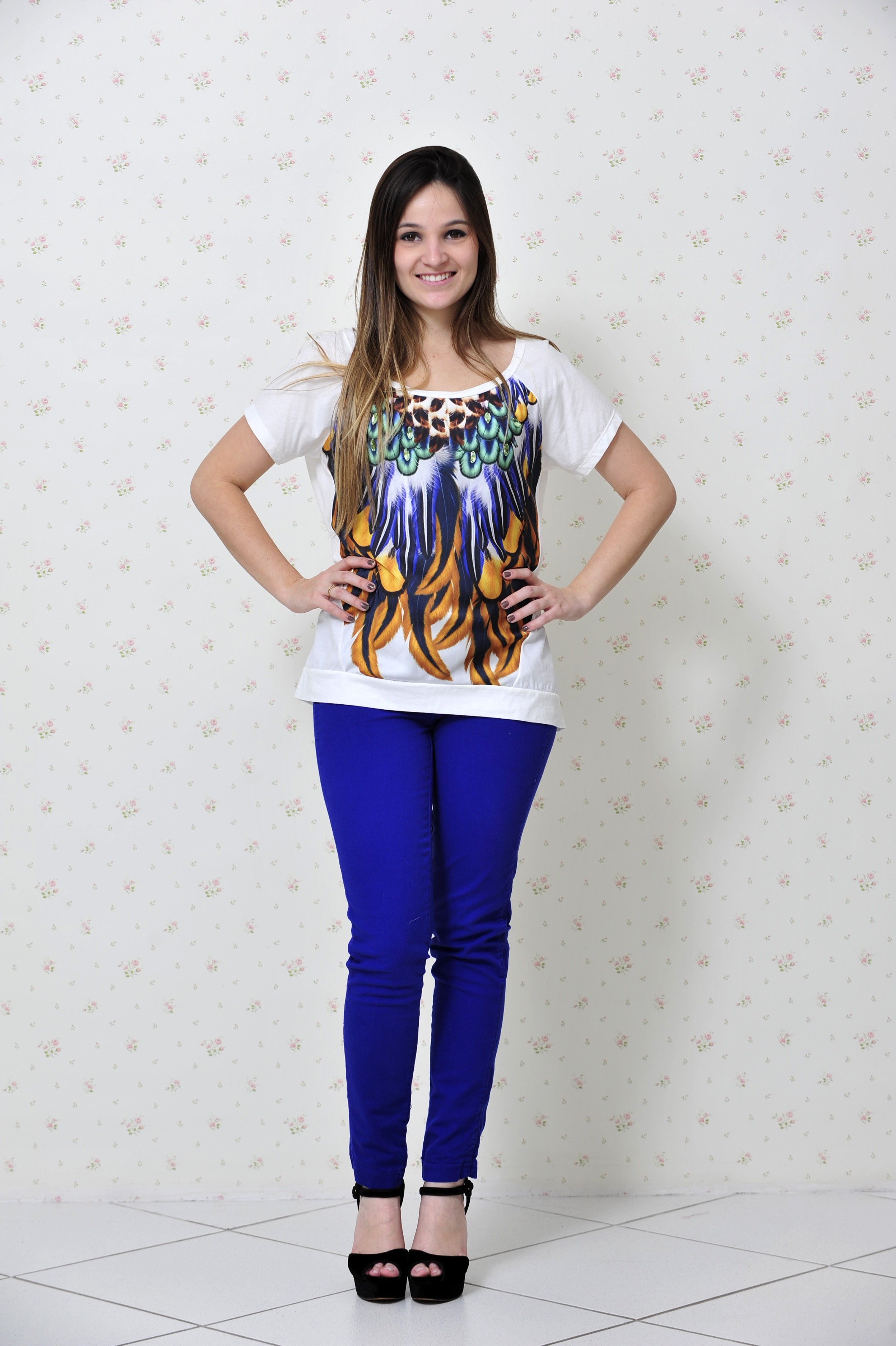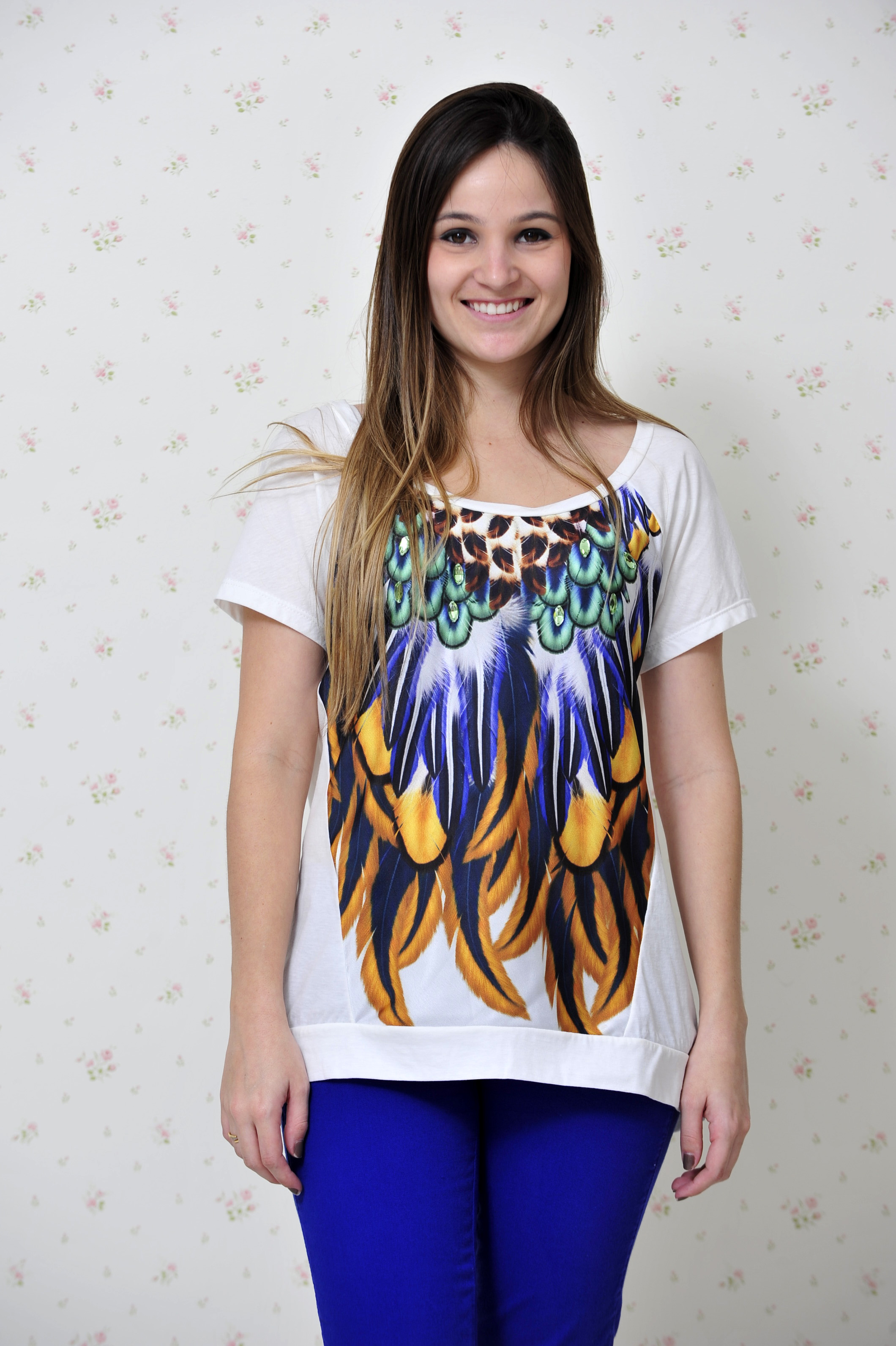 No look usei uma blusa com estampa de cocar, com os mesmos tons da calça… Adorei o contraste e achei que super combinou! E depois da febre das calças flare, os modelos das calças para o verão aparecem mais justinhas.