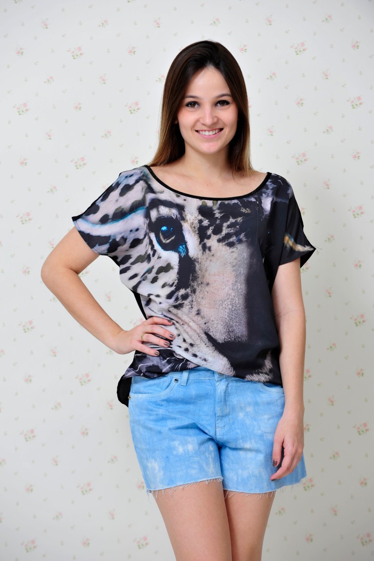 Daí lembrei que tinha um look Impactto Modas com uma blusa animal face que ainda não tinha mostrado pra vocês. Para compor o look, usei um shortinho azul sky.