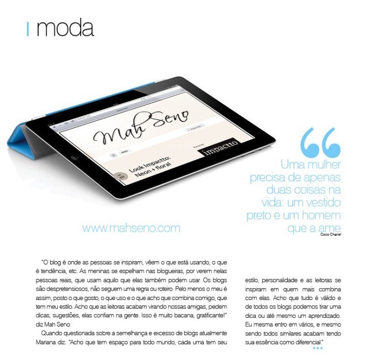 Bom dia meninas!! Adoro começar a semana trazendo novidades… Vim compartilhar com vocês mais uma conquista do Blog Mah Seno. Tive o privilégio de ser convidada pela minha amiga, blogueira e colunista Mariana Marin a participar de uma matéria super bacana sobre blogs de moda para a Revista Mais Mulher de Votuporanga.