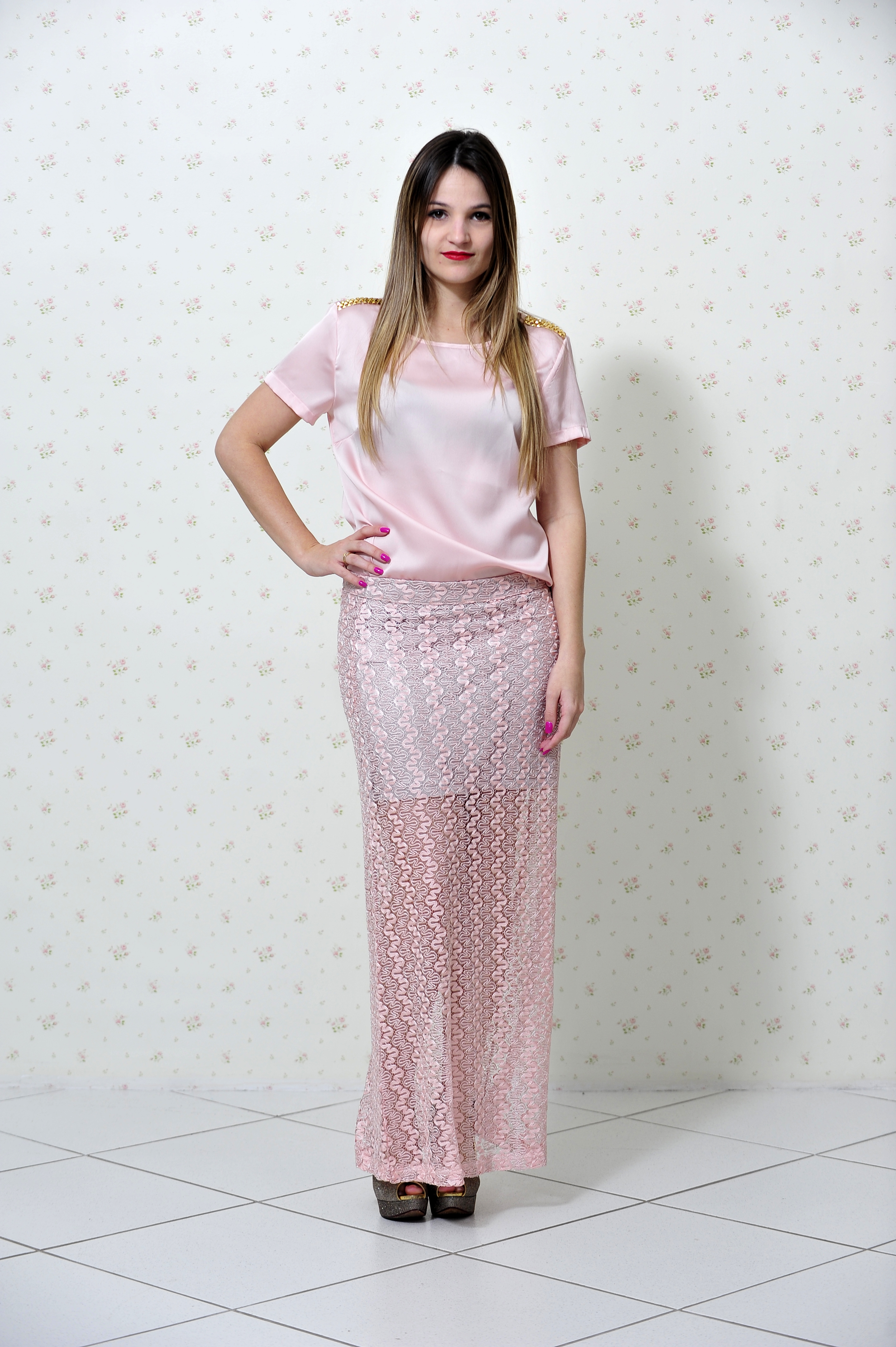 Não existe composição mais feminina e delicada que cetim + renda, e o look de hoje é exatamente com essa mistura, blusa de cetim com detalhe de tachas no ombro + saia longa de renda.