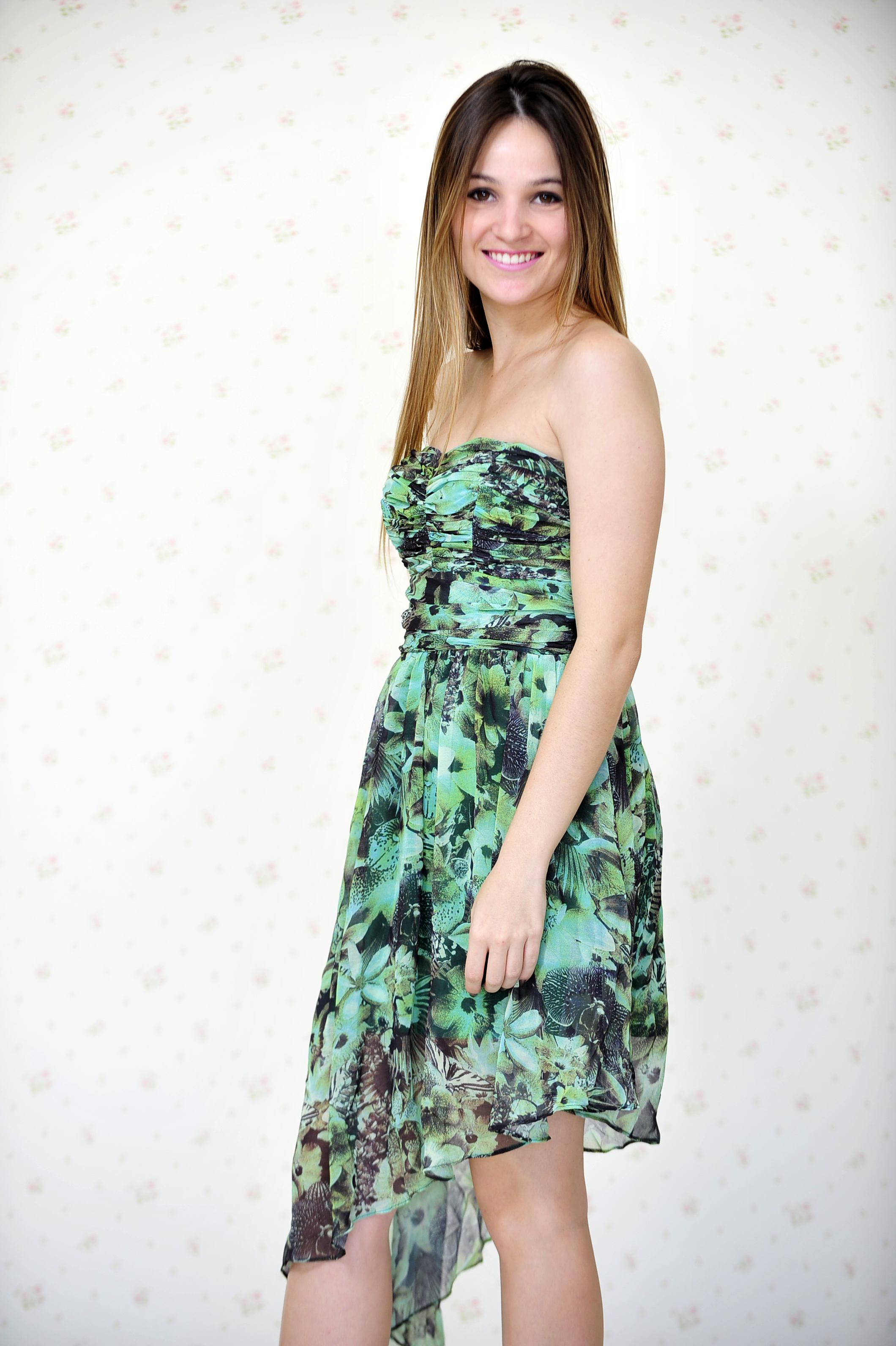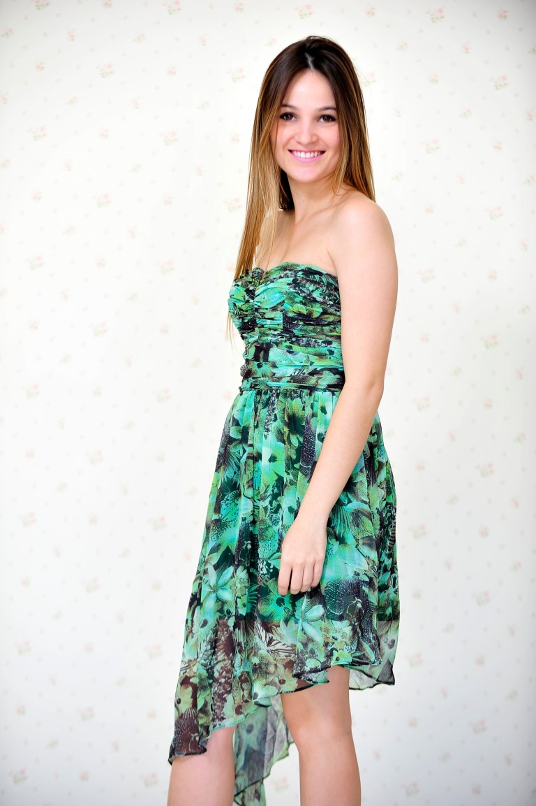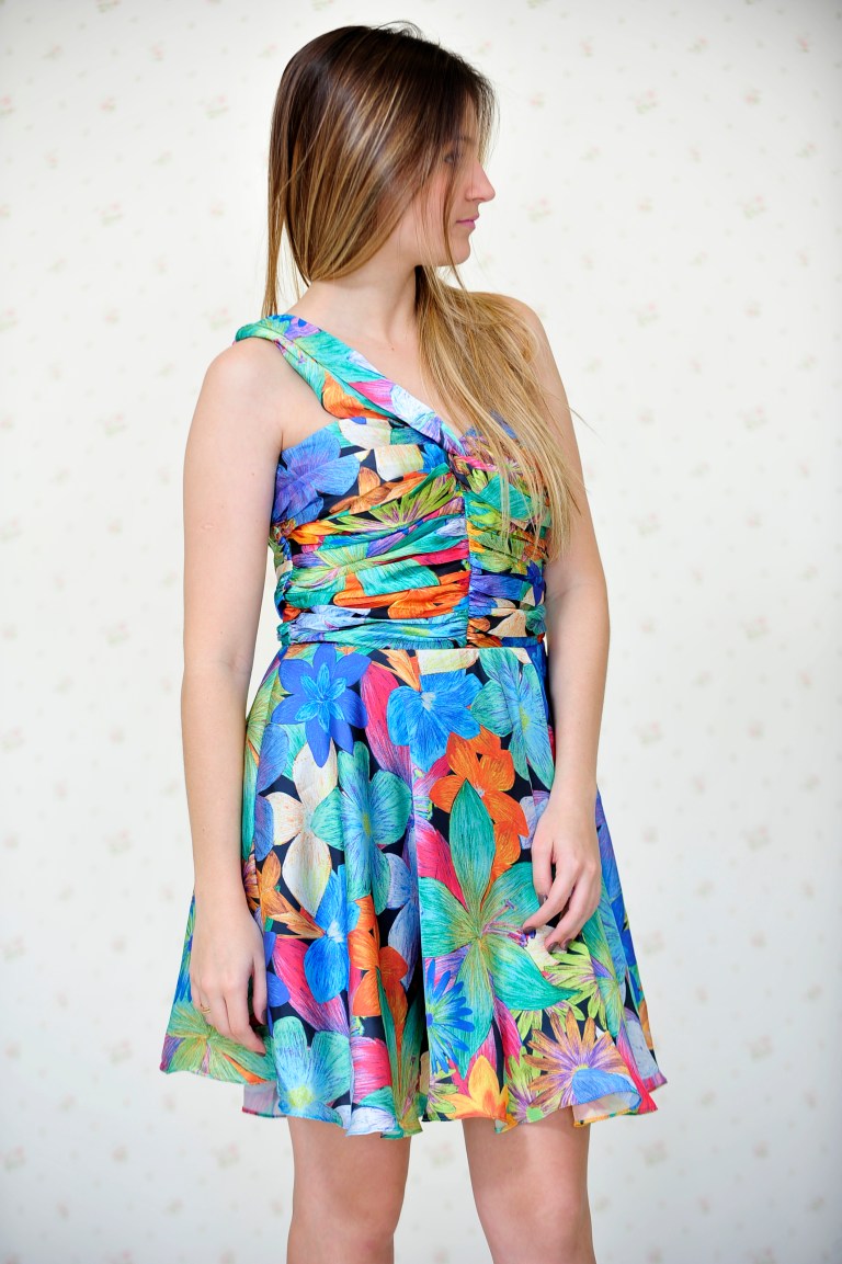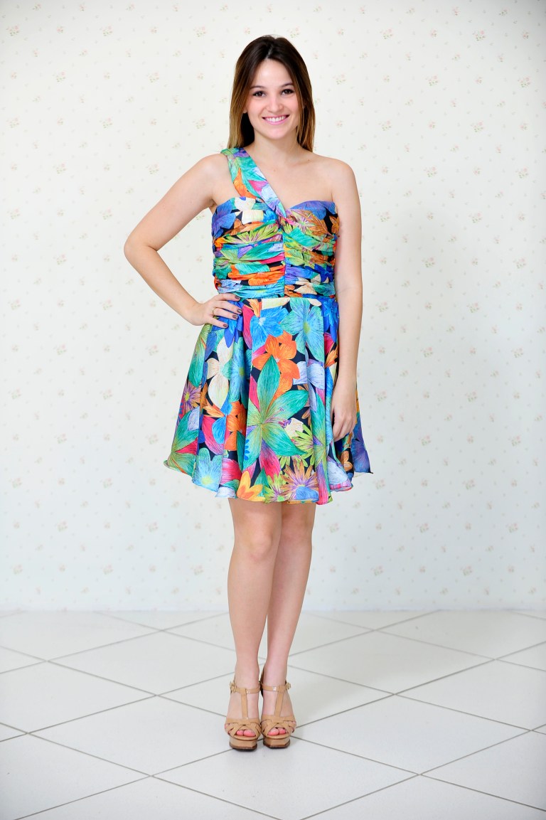 O segundo vestido é floral de um ombro só, com uma estampa super colorida.